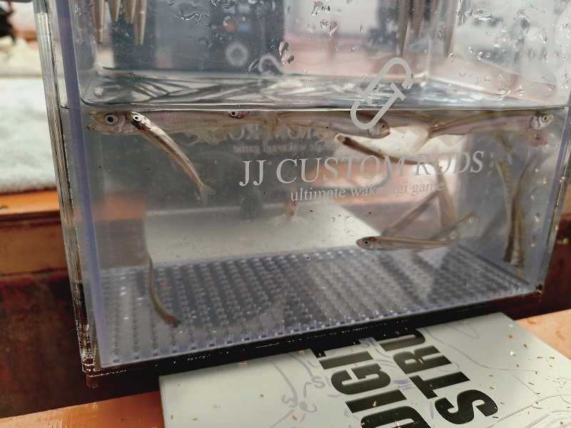 今シーズン初の桧原湖北部。ターンオーバーの濁りはまだ取れず中層、ボトムには泥や切れた水草が結構漂ってます。午前は6~8m中層に群れが入りポツポツですが、当歳魚の群れで喰い込み浅くバレが多いです。ボトムに入るワカサギは当歳魚~デカサギとサイズはバラバラ。エサはサシの方が喰ってきたように感じました。イワナやウグイなどの外道もまだ動いているので予備の仕掛けは多めに。