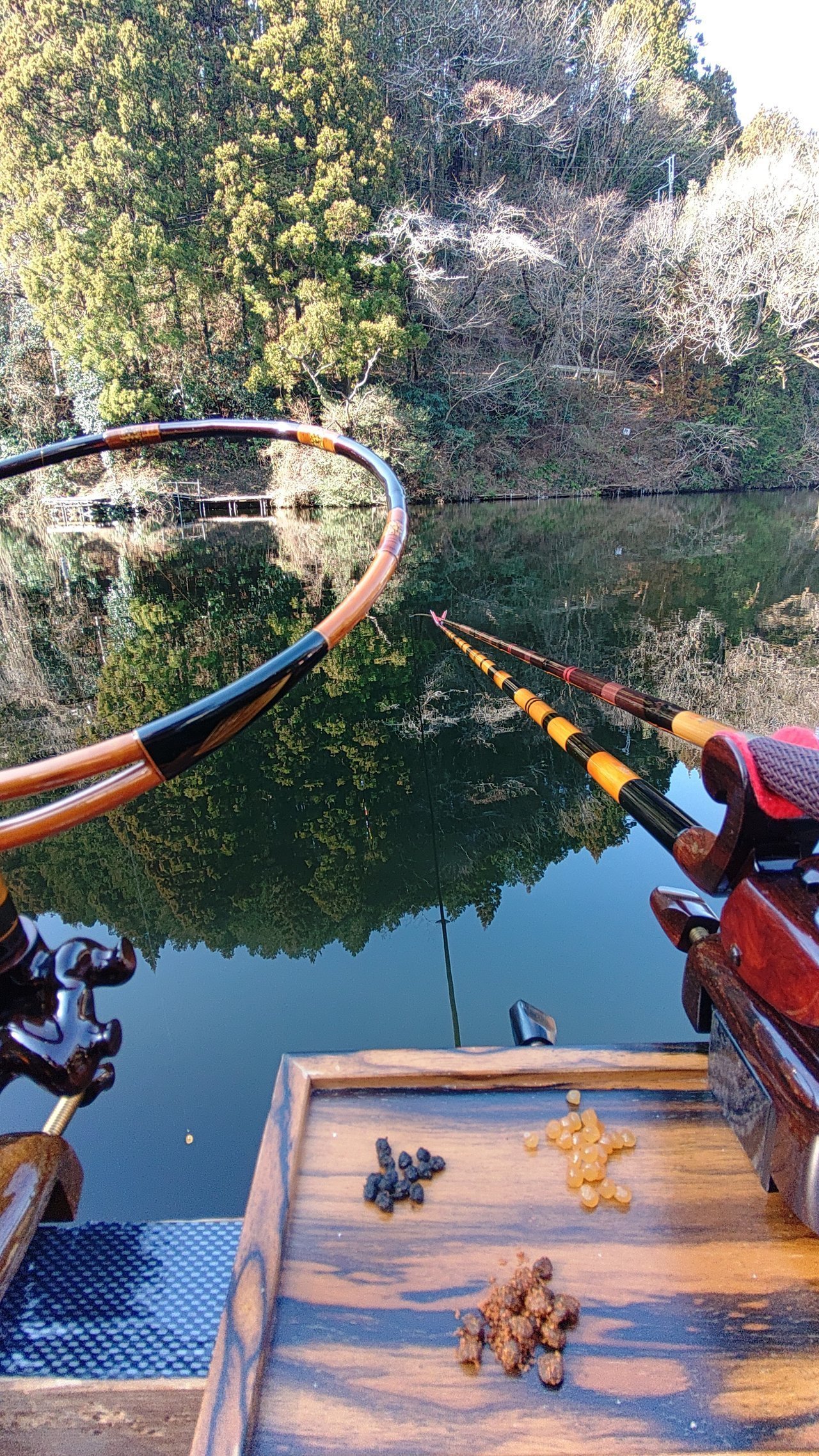 ■釣り方:1〜2本半の力玉のセット釣り ■竿:シマノ 朱紋峰 煉 16尺 ■浮子:巧実 バトルシリーズ 浅ダナセット M(2目沈め) ■道糸:東レ 将鱗へら スーパープロ 道糸 フロロ ゴールド 0.6号 ■ハリス:㊤:ダン へらハリス 0.4号/8CM ㊦:ダン へらハリス 0.3号/45CM ■ハリ:㊤:ハヤブサ 鬼掛け 極ヤラズ 鋒 6号 ㊦:ハヤブサ 鬼掛け 喰わせヒネリ 2号 ■エサ:《バラケ》マルキユー 粒戦100+瀑麩チョイ盛り100+水150 を粉の状態で良く混ぜ合わせる。 その後、水を入れたらしっかり吸水するまで数分放置。 吸水し固まってきたら《ふぶき 大盛り200》を入れ熊手で良く混ぜ合わせる。 一握り半ぐらいを別ボウルに小分けをする。 小分けしたバラケをエアーを抜いたり/エサ付け時のチモトの付け具合や圧等でナジミ幅/バラケ具合をコントロールする。 基本は手水と基エサで調整。 クワセ マルキユー 力玉 大粒 改/にんにくさなぎ玉/クロレラ黒玉。 ■飯:※本日は完デコの為帰飯は控えさせて頂きました。