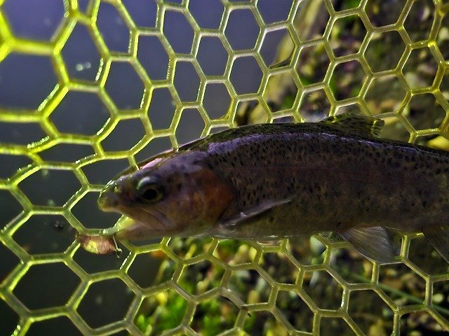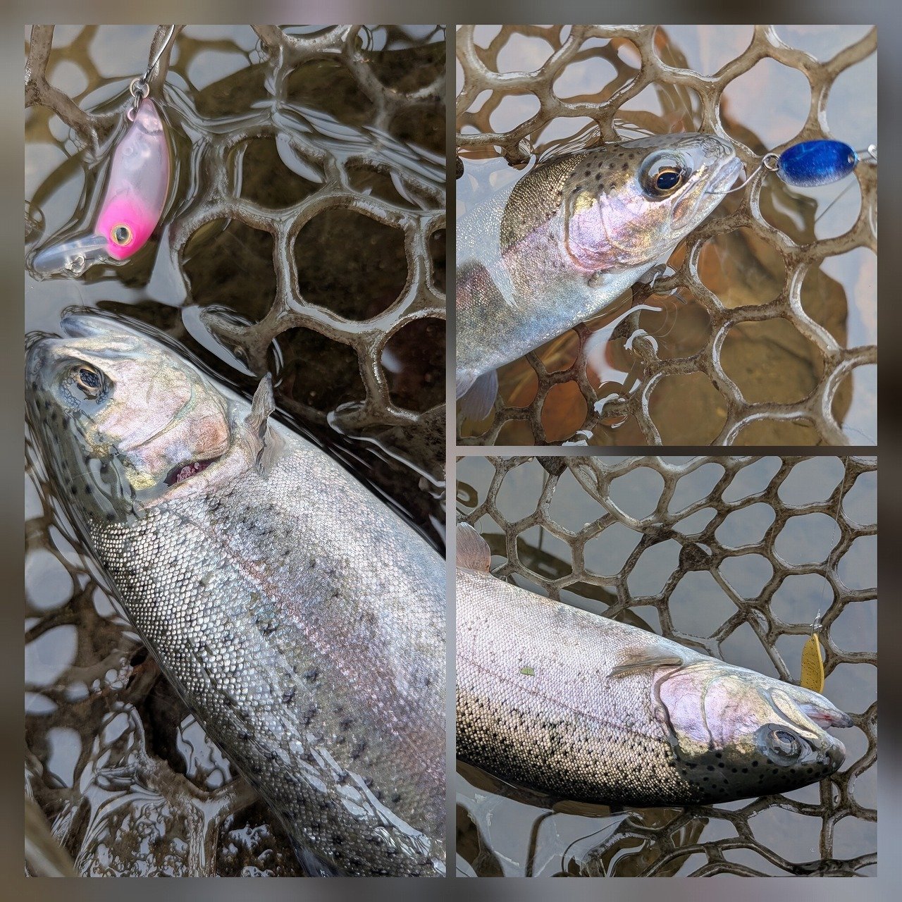 魚体のキレイで元気なニジマスが楽しませてくれました!ながれの緩いポイントだったのでタックルやルアーはエリアトラウトで使うもので釣れます!