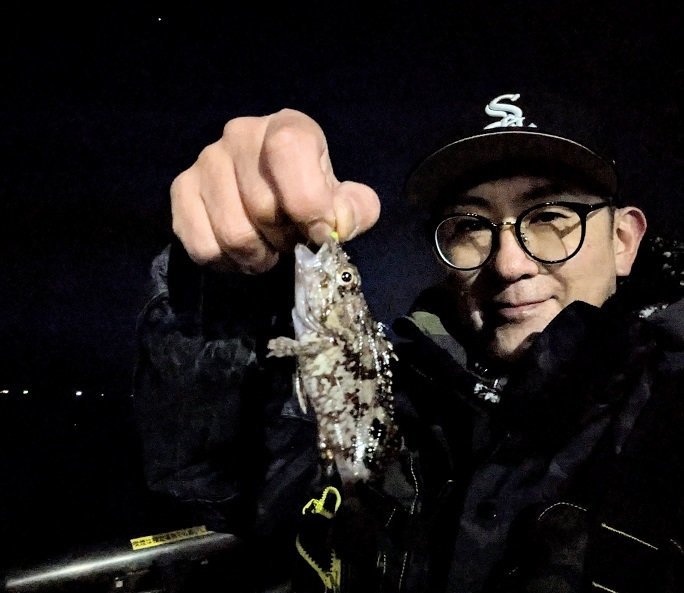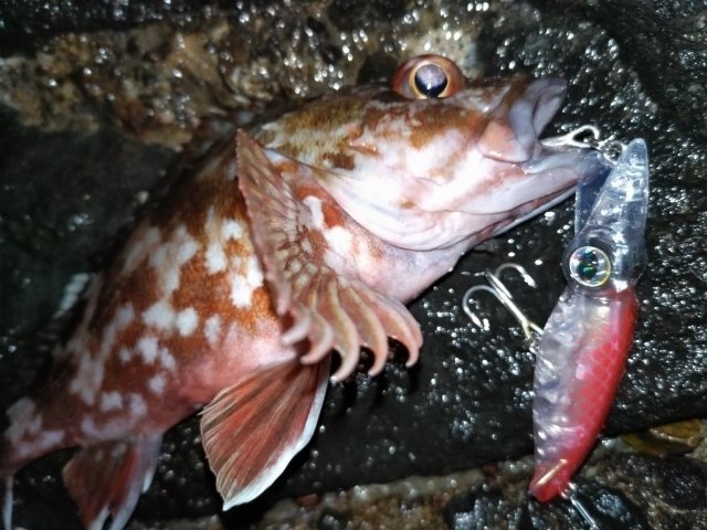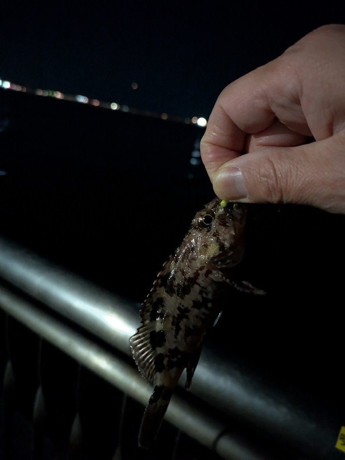 上がってきたのは、とてもかわいいサイズのカサゴでした。しかもキャストせず足元に落としたタイミングでした。写真を撮ってすぐにリリースしました。