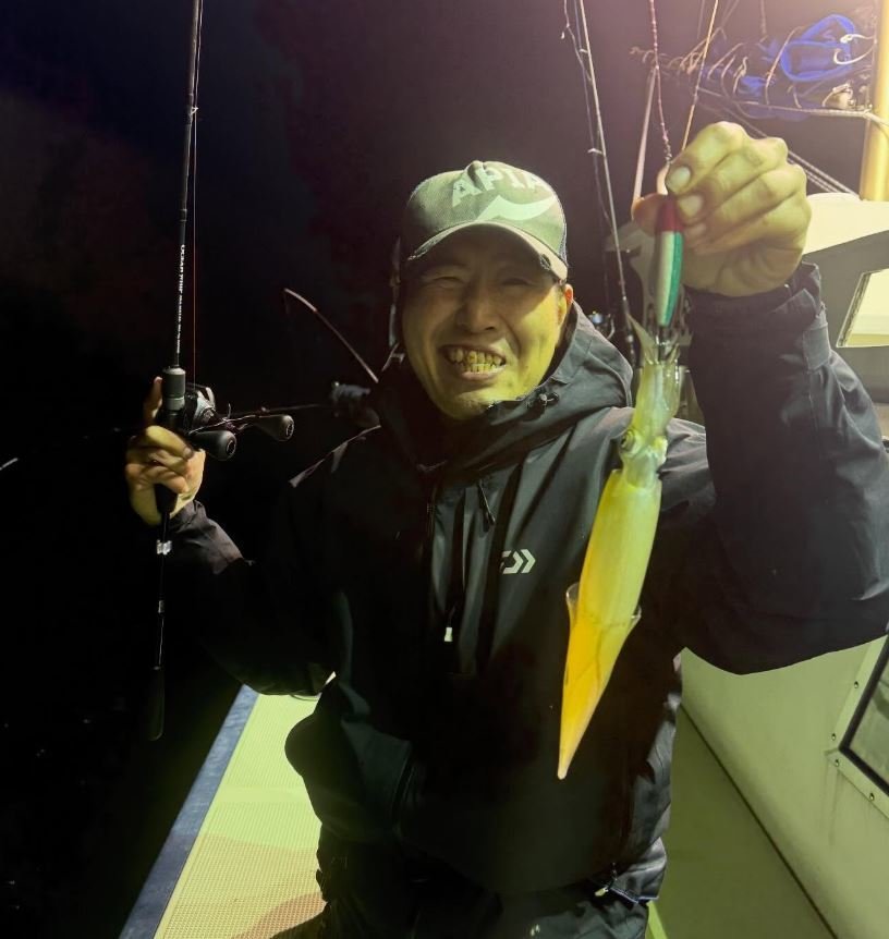 実は前回は惨敗したスタッフ美濃崎、今回はどうなることやらと思いつつスタート。開始しばらくは反応なくヤキモキしますが穂先が曲がったのに合わせるとヒット!クレイジーオーシャン「バインドアッパー」に「塩ささみ青」を巻いたものにしっかりとヤリイカが喰ってきてくれました!その後も船中でポツポツとイカが上がる中、スタッフ片岡の竿にもアタリが!しかしながら乗り切らずカーブフォールさせつつ誘うと再度アタリ、今回はガッツリと合わせてイカをキャッチ!その後もイカを追加しつつヤリイカメタルを楽しみました!