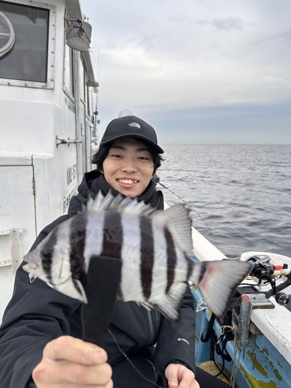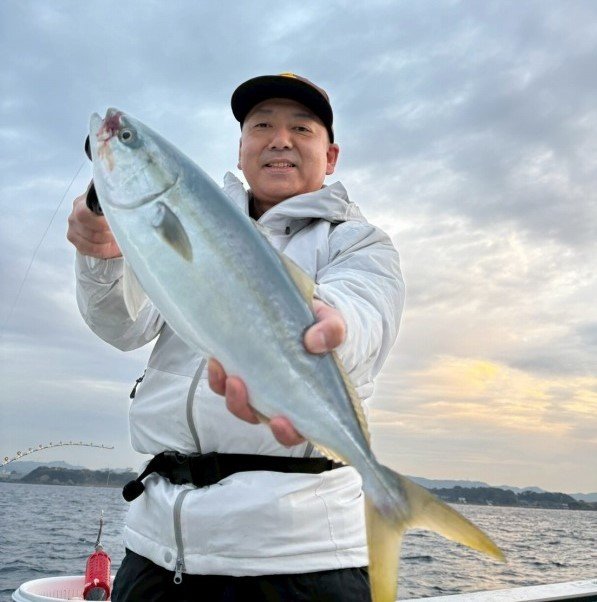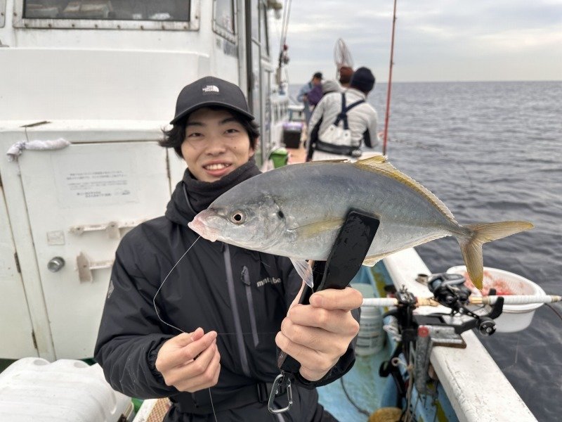 しばらくして、左舷側に座ったスタッフTAOのロッドが勢いよく引き込まれ、小型ながらもシマアジをゲット。