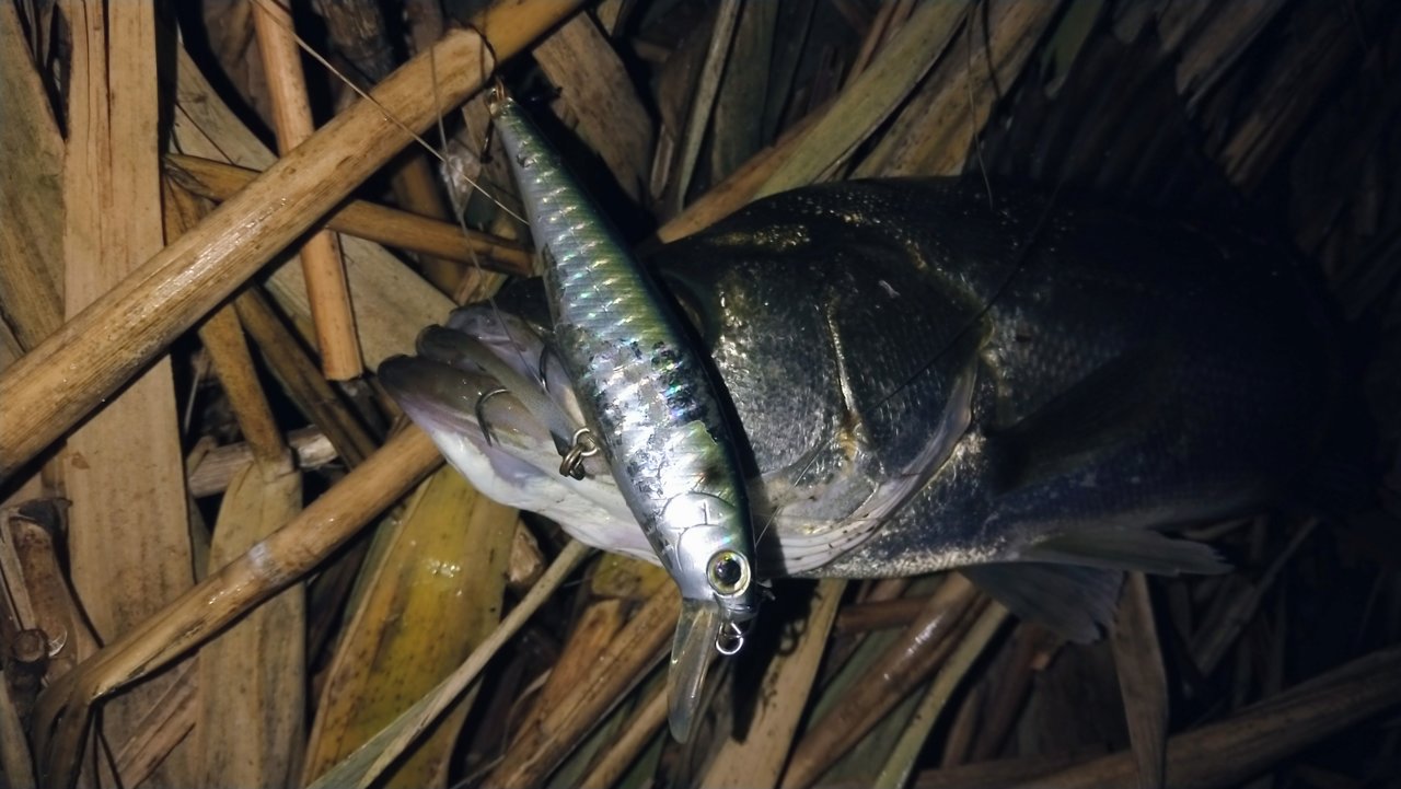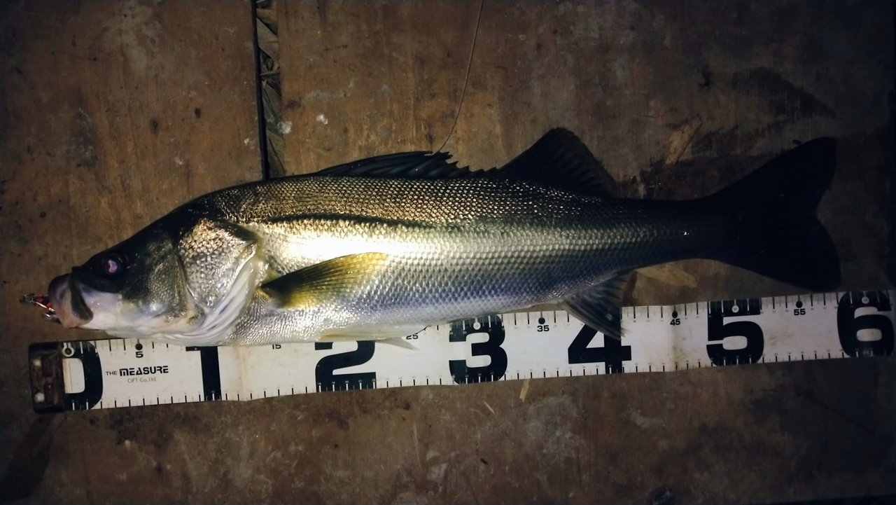 ベイトが流れてくる気配無し。もちろんシーバスの気配も時間が延々過ぎる中、常連さんが1本ゲット!しかし単発。手前にベイトが流れてくる気配が出た20:00くらいに手前をオグル85SLMで通すと40cm。続いてビーフリで35cm。手前にはコノサイズが適度にいるみたいだが、大きいのはいないっぽい。しかし、沖の筋も同様。