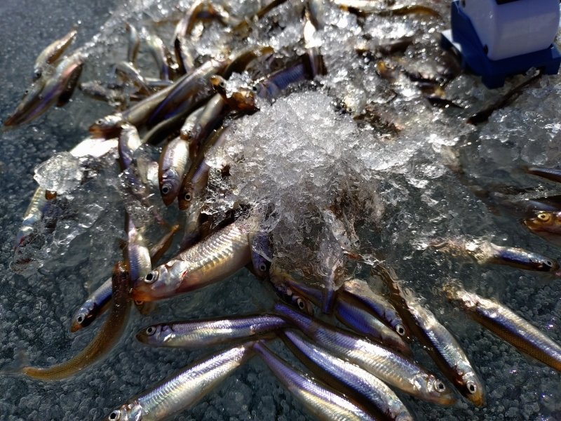 今期2回目の松原湖。湖面に雪は乗っておらずツルツル真氷でアイゼンが必須。今回は朝一数狙いでポイントを設定、何カ所か穴をあけると宙層にワラワラとワカサギの反応が有り、その場所にスタッフ江村&福島からはるばるやってきたスタッフと3人で入る事に。ばらけて浮き気味の当歳魚を1.2m仕掛で棚広く釣るが、大きいのが混じらず面白みに欠けるので9時過ぎに場所移動。松原湖の中ではデカサギ狙いのポイントへ♪昼食をはさんで16時までポツポツ掛かって132匹と楽しめました。