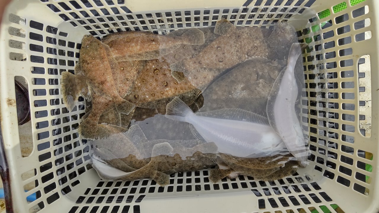 そのような中6時に出船、湾内の50~60mラインのポイントに向かいます。底荒れの心配をよそに開始からポツポツと釣れ始め、徐々に良型も混じり出します。順調に釣れていたものの10時にエサが無くなり終了、かごの中を数えると30枚。大きいのだけ選んで小さいものはリリースし持って帰ってきました👍。トップの方は11時までで40枚以上釣っていたそうです。