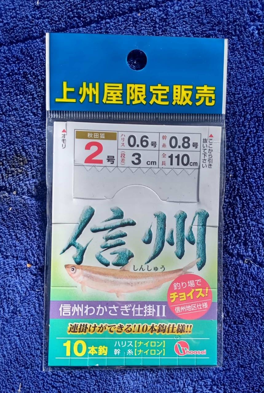 ■ロッド:渓流竿「岩清水4.5m」 ■ライン:道糸:0.8号 ■仕掛:わかさぎ仕掛「信州 10本針 2号」 ■オモリ:夜光ナス1号 ■エサ:紅サシ