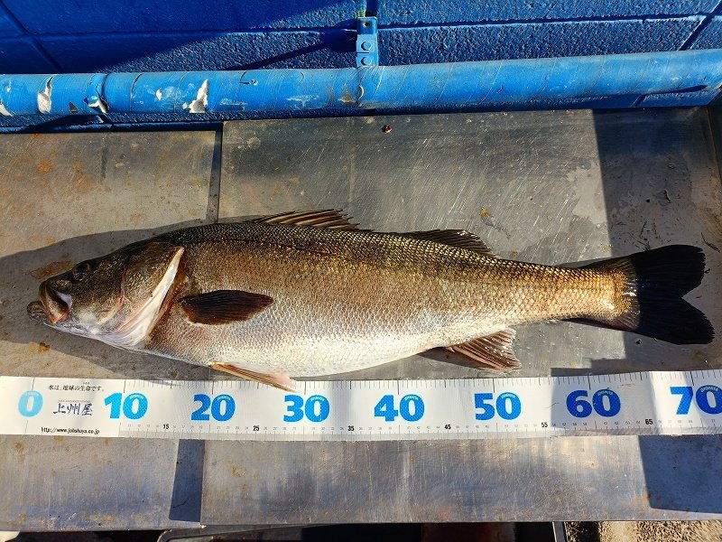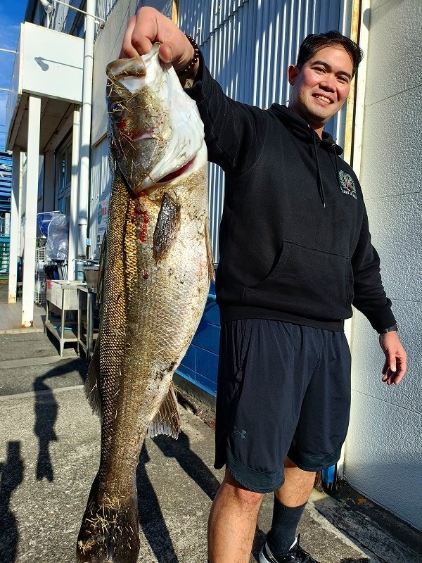 デイゲームでシーバスゲット!お客様のアンディさまより釣果のお持込みを頂きました♪釣り場は「ベース」と呼ばれる横須賀基地。ヒットタイムは正午ごろ。ご自身初となるシーバスキャッチとなりました。お持込み頂いた時は釣りたててでまだバタバタと元気な状態。メジャーをあててみると74㌢のグッドサイズ。ベイトをガッツリと食べてお腹もパンパンのグッドプロポーションの魚体でした。アンディさま、この度は初めてとなるシーバスのキャッチ、おめでとうございました^^/。次の大物を目指して引き続き釣りをお楽しみくださいませ^^。今回のヒットルアーはワームとの事。デイゲームではブレード付きルアーとワームが必殺アイテムとなりますので皆様も是非お試し下さいませ。