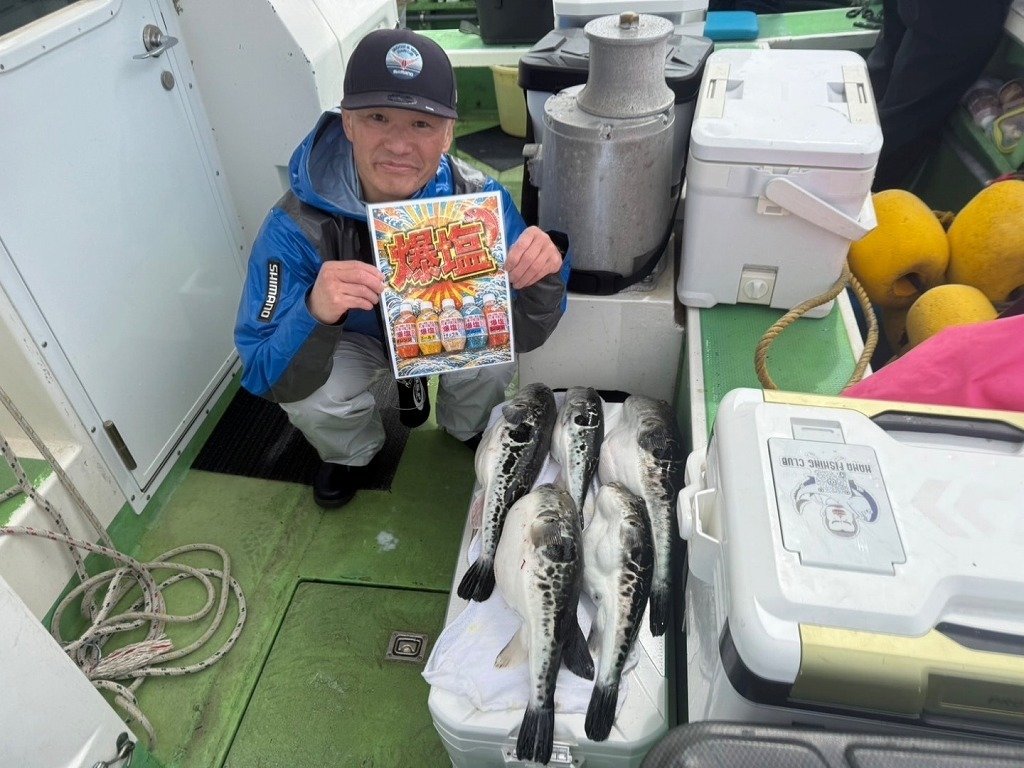 勝山港の萬栄丸さんにお邪魔してトラフグ釣りにチャレンジして来ました。前日がXデーだったせいもあり港は異様な熱気に包まれていました。出船して最初のポイントはアタリ無し。次の剣崎沖でようやくアタリ何とか1匹ゲット。それからコツをつかんだのか順調に数を伸ばしてなんと規定数達成することが出来ました。帰宅後は白子とあごの部分を美味しくいただきました。メインの身は熟成中です。当日の釣り方状況など詳しくはスタッフまでお尋ねください。