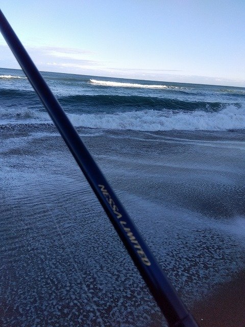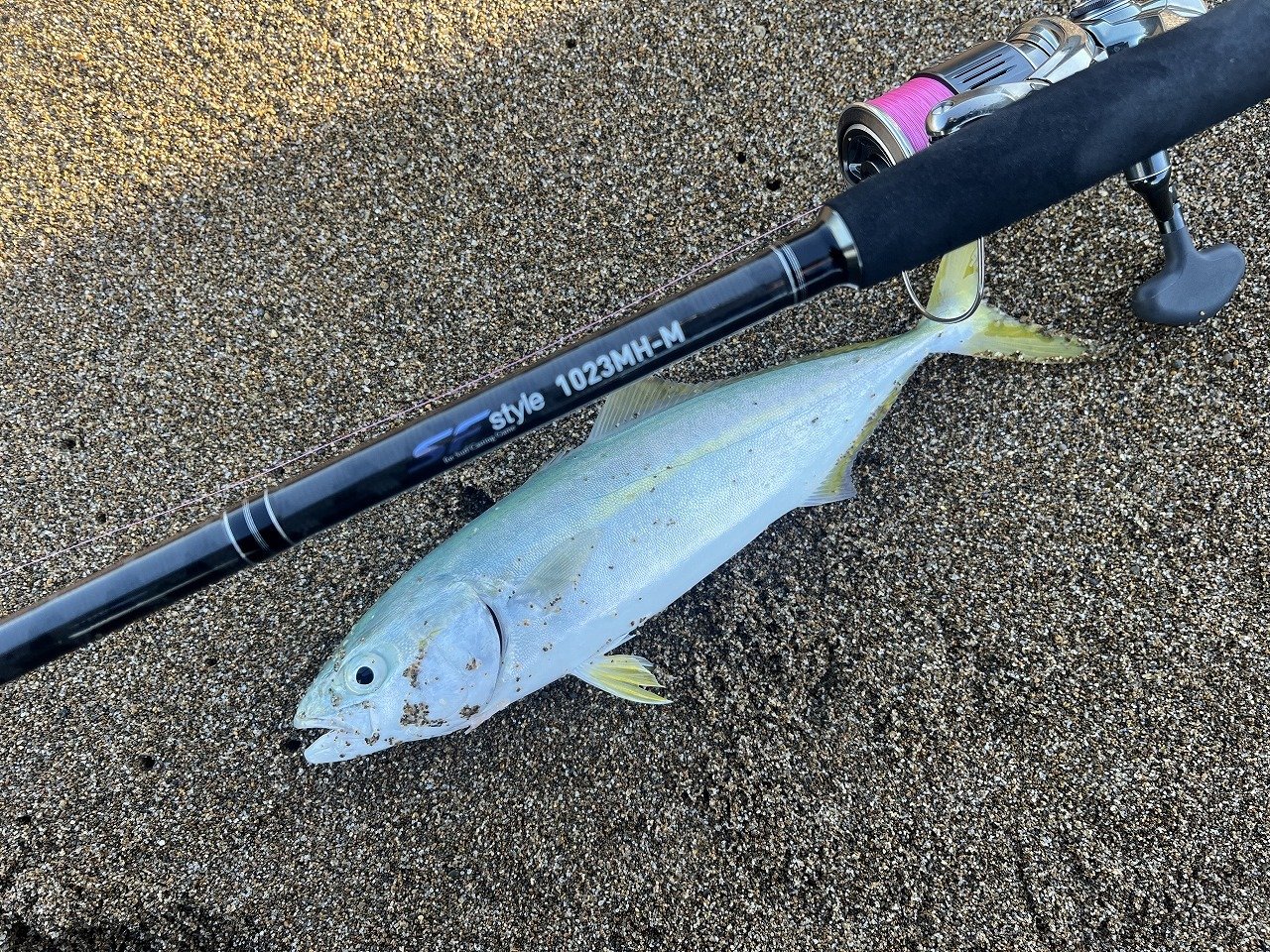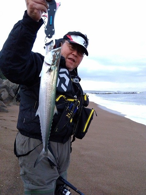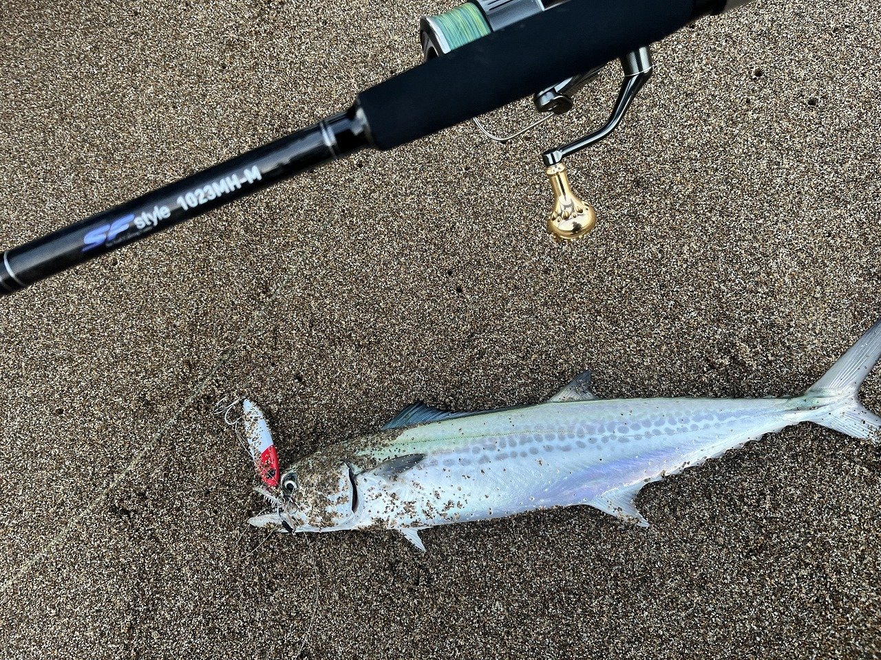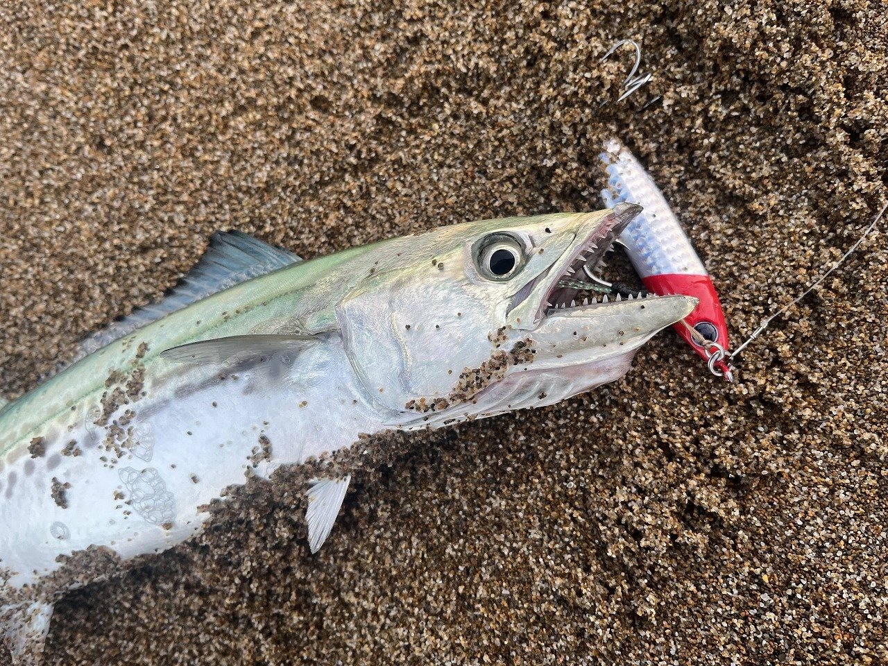 上州屋サーフ釣行会で福井県波松海岸に朝5時集合。多少波は高めだが、こういう日の方が大型が出やすいとか?大分明るくなった6時半、デュエルヘビーショット105をキャストしていると「ゴンゴン」とアタリ。余り大きくは無いが横に走るので青物かと思いながら砂浜にズリ上げると定番のサゴシ君でした。同じような時刻にまさか、あんなモンスターが釣れているとは思わずにその後もキャストを続けますが、潮止まりまで異常はありませんでした。その後10時に集合してみると他スタッフもサゴシやツバスなどを釣っていましたが、なんと81㎝のモンスターヒラメが上がっていて一同ビックリ。私の竿はシマノさんよりお借りした「ネッサリミテッドS1010M+」。操作の軽さ感、感度も良く、硬すぎないしなやかさも感じられました。海の状況次第ですが、また是非行ってみたいと思える釣行会となりました。