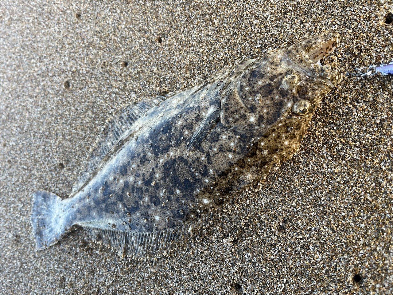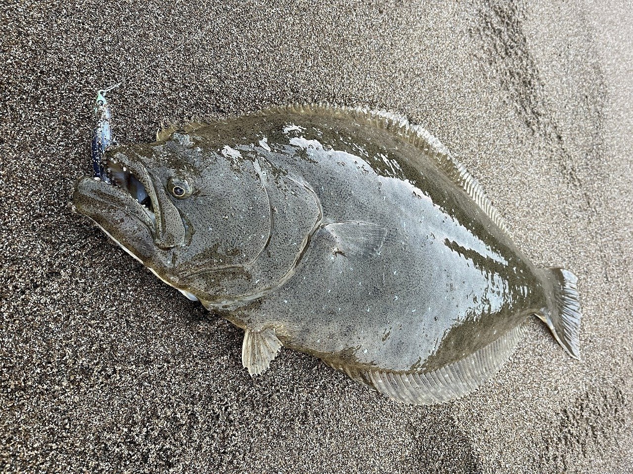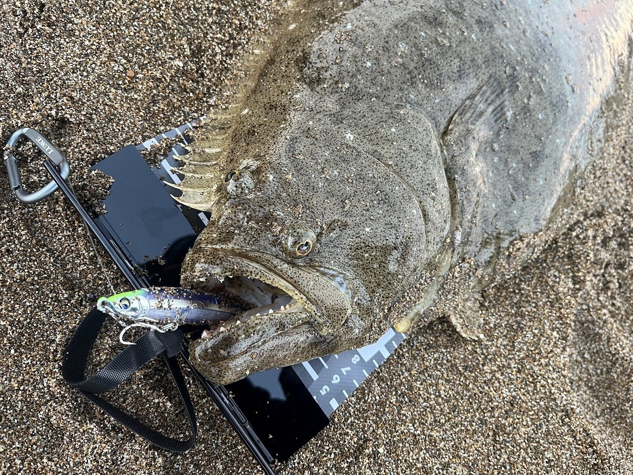 時折強めに締めていたドラグが出る引きの強さ。波を利用しつつ寄せてきて浜へ上がってきたのはヒラメ!メジャーで計測すると81cm!!文句なしの座布団ヒラメ。