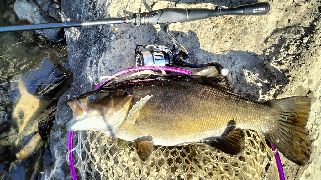 ■ロッド:シマノ ポイズンアドレナ264UL-S ■リール:シマノ ヴァンキッシュ2500SHG ■ライン:DAIWA フィネスブレイブZ 4lb ■ルアー:OSP ハイカットDR-SP、ニシネルアーワークス ドロップショットミノー2.5、ケイテック ライブインパクト3インチ、自作フットボール3/8oz+バークレイ マックスセントリルトゥルーパー