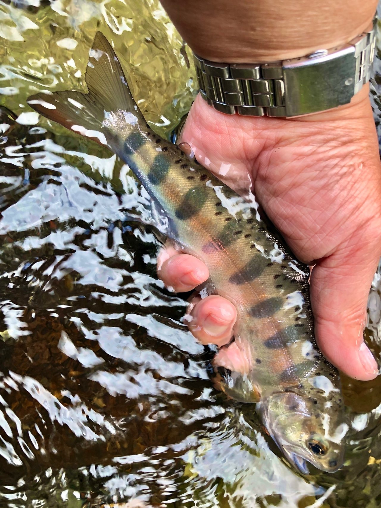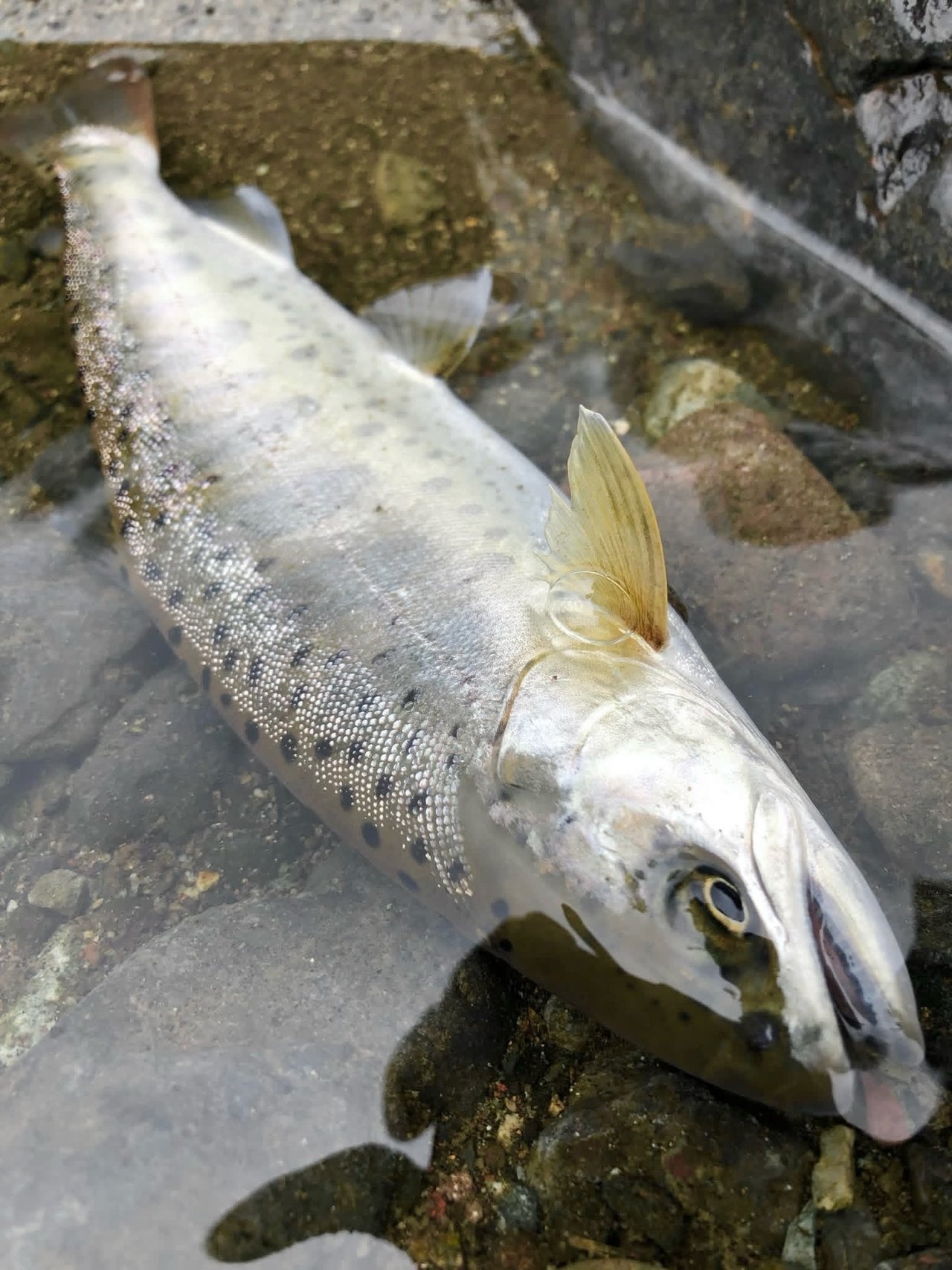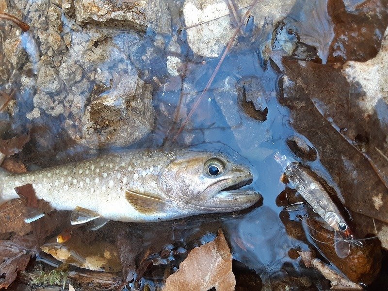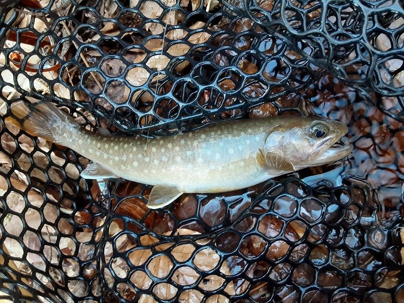 やっと良型のイワナをキャッチ。今日はここが最後のポイントで落ち込みからのカケアガリで良型をキャッチ。更に倒木のすき間にルアーを落とし込んで最後の最後に尺イワナをキャッチして納竿です。