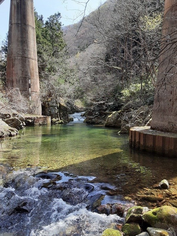 釣り場を更に上流へ。初めて入る区間。入渓点の砂防堰堤から水面を見るとイワナの魚影を確認。