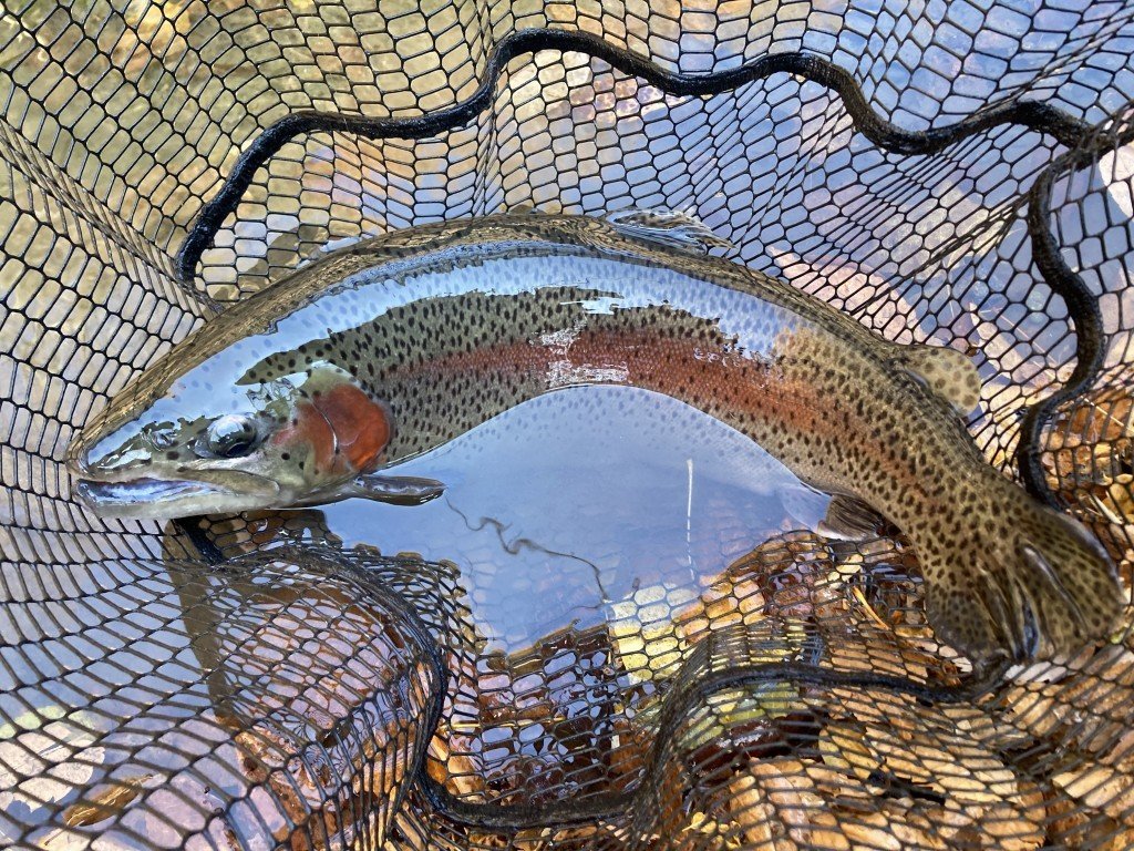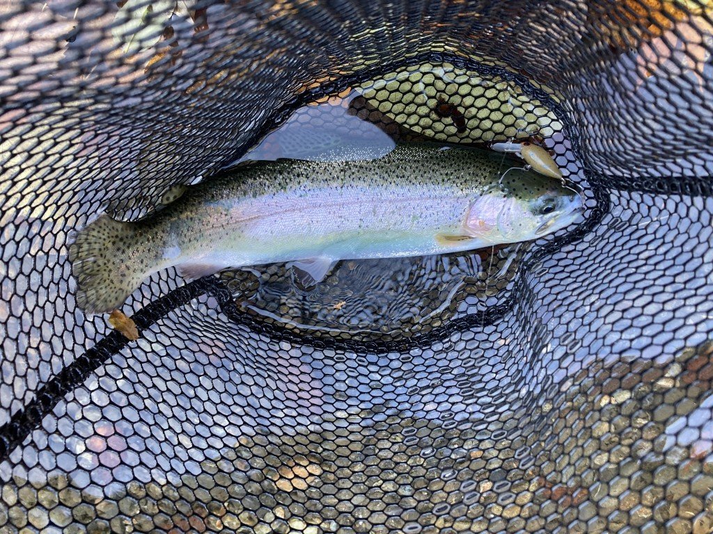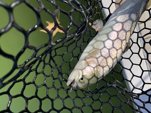 朝8時半集合するとやや混み気味・・・この日は放流日でした。朝一河原の駐車場前からスタート。まずは水温低下でボトムに狙いを定めボトムルアーを試すも不発。伊勢崎店のスタッフが小ぶりのクランクでいきなりいいサイズのハコスチをヒットさせていたのでクランクに変更しますが、ヒットした瞬間痛恨のラインブレイク・・・気を取り直し、上流へ行き空いている場所で様々なルアーを試しますが、ジャンプで外されたりと上野村ハコスチの洗礼をこれでもかと喰らいました・・・お昼を挟んで下流でようやくクランクにヒット!しかし後が続かず。バラシ多発で心折れそうになりながら上流でボトムルアーを試すといい反応!!