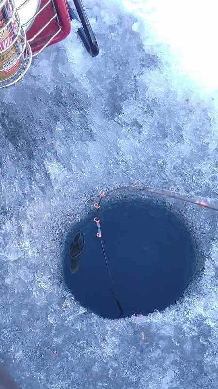 前日の夜からの降雪で氷上には5~8cmぐらいの積雪がありました、今回入ったポイントは1号ドーム桟橋の沖辺りです、規制リボンの1mぐらい内側に入りました。