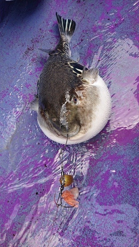 ググンっと少しなったアタリで合わせるもすっぽ抜け。本来これで合わせちゃいけませんね。完全に焦ってました(^^ゞそんな中で船中では1匹釣れて他船もポツポツといった感じの冨浦沖でしたが次に向かったのは剣崎沖~金谷沖。開始1投目からさっきとはぜんぜん違うガツガツっと竿先が入り込む良いアタリがあり待望のヒット!周りもアタリ始めていたので急いで針を外してすぐに投入でこれまたヒット!船中タモが間に合わないほどバタバタ忙しくなり、とうとうやってきましたXデー♪良い日に来れました!そんな感じで10時ちょい過ぎあたりで規定数の5匹釣り上げて11時には早上がりとなりました。港へ戻るまでに血抜きしておきさばいていただいたトラフグは4匹が白子入りでした。使用オモリはルミカの攻略シンカー・ダイワの快適シンカーSNで針は2本針でやりました。