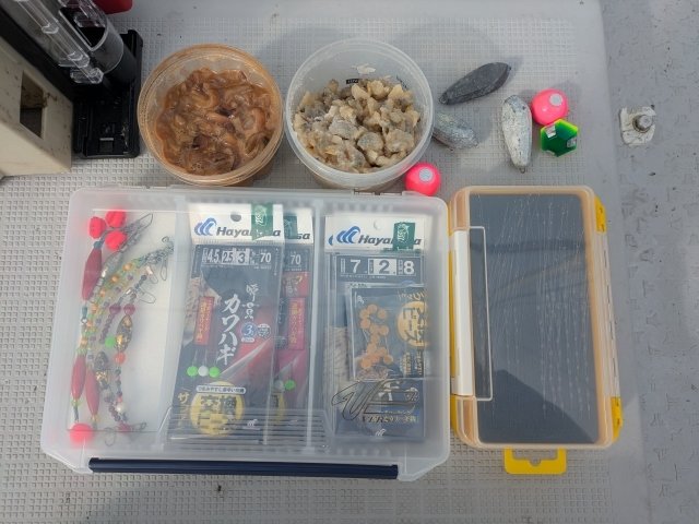 ■ロッド:カワハギ専用ロッド ■リール:カワハギ専用及び軽量両軸リール ■ライン:PE0.8~1.0号 ■仕掛け:カワハギ専用3本バリ仕掛け ■エサ:アサリ・イカタン(キモ漬け)・青イソメ・オキアミ等々・・・
