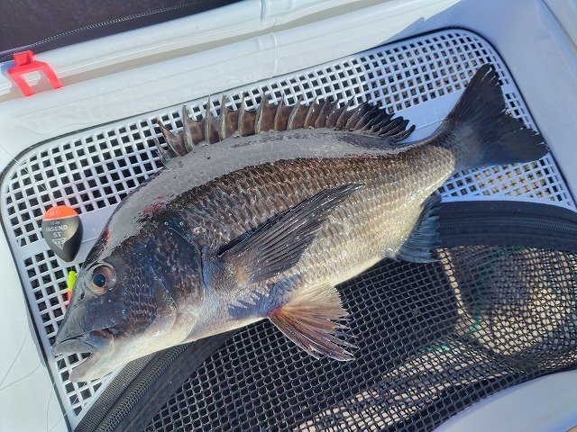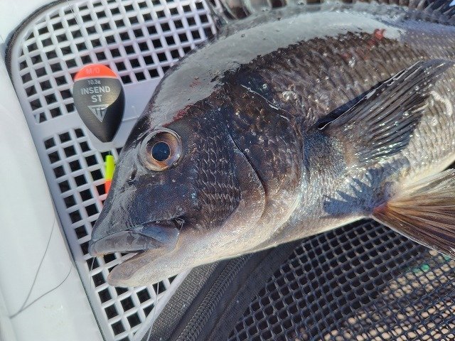 釣りの方はと言うと、昔はやっていなかったノーガンの釣りを練習。ほぼほぼオモリ無しで通してみました。釣れたクロダイは、ウキがシモっていったので「潜り潮か?」と思いきや、竿で「そおっと」聞いてみると魚の反応でアワセた感じでした。水中で「ギラッ」と見えた時には「アイゴか?」と思いましたが、まさかのクロダイの出現にビックリでした。