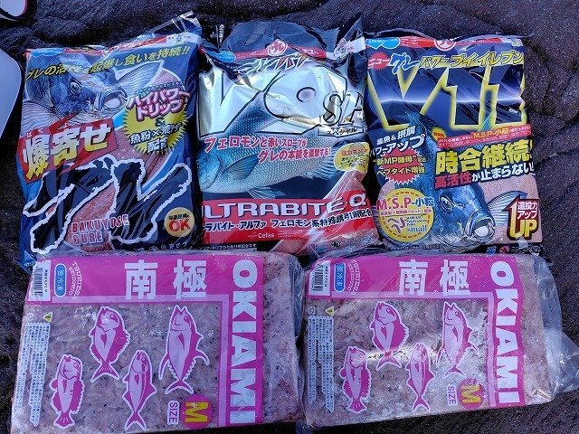 ■竿:シマノ α-ZOOM磯XL T1 48-54 ■リール:シマノ BB-Xラリッサ 2500DXG ■道糸:サンライン マスラード1,75号 ■仕掛:ウキ:釣研 インセンドST M/0 L/0 ■エサ:コマセ:オキアミ3Kブロック×2枚、マルキュー:爆寄せグレ、V9SP、V11 付けエサ:生オキアミ、マルキュー くわせオキアミV9