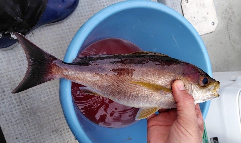 5時過ぎ出船、沖に走って水深50~80mの根まわりポイントを流していきます。前半は水温低かったせいで渋くポツポツ。中盤から一気に水温が上がって賑やかになりました。