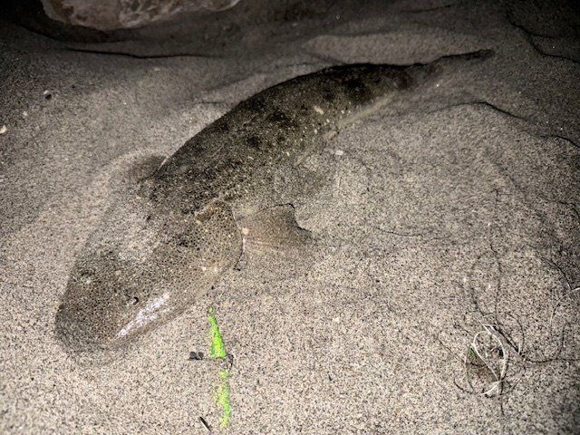 久しぶりに遠州サーフへ行って来ました。何やら今年は「オオニベ」が好調との噂です。そんなに簡単には釣れないと分かってはいるもののベイトタックルを新調してあわよくば釣れたらいいなーと出掛けます。午後2時半満潮です。お昼過ぎに静岡に入ってまずはさわやかハンバーグで腹ごしらえ。明るい時間はメタルジグやシンペンで歩きますがノーバイト。きれいな夕焼けを見ながらベイトがいるエリアで夜を迎えます。夜はでっかいミノーを何かを期待して投げ続けます。突然ぐぐーんと反応が!ドキドキしながら合わせを入れます。でも引きがなんか違う感じ。上がって来たのは「オフベイト」が引っ掛かったマゴチでした。サーフのお散歩も楽しいですね♪また機会をみて行って来ます!!