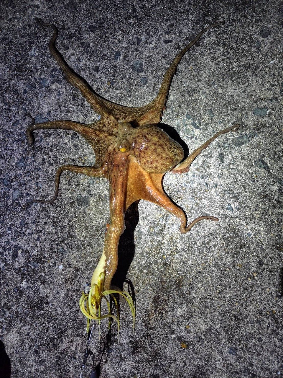 先に現場に着いていた稲田氏でしたが反応が薄い為、ポイントを点々としていたら雰囲気の良いスポットで「トン!トン!ムニュ、ムニュ」と明確なアタリがありまして....運よく1タコ800gGETでした。