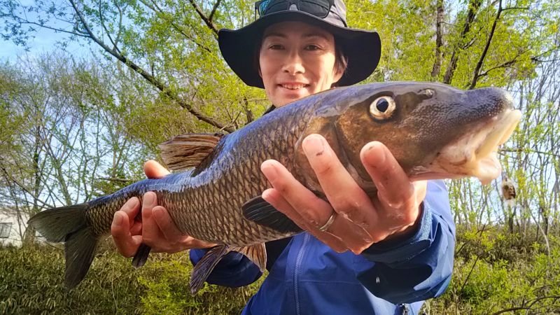 スプーンやプラグ等色々使ってアプローチ。最大60cmほどの大物も掛かりトラウトロッドが根元から曲がってスリリングな釣りを楽しめました。次のポイントではスポーニング絡みのヘラブナが沢山見えてスプーンで一匹。その後本命のオイカワを一匹釣る事ができて、大満足♪