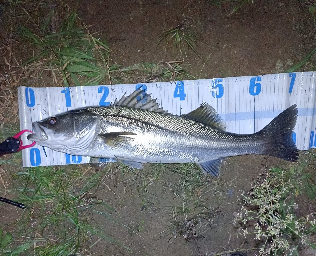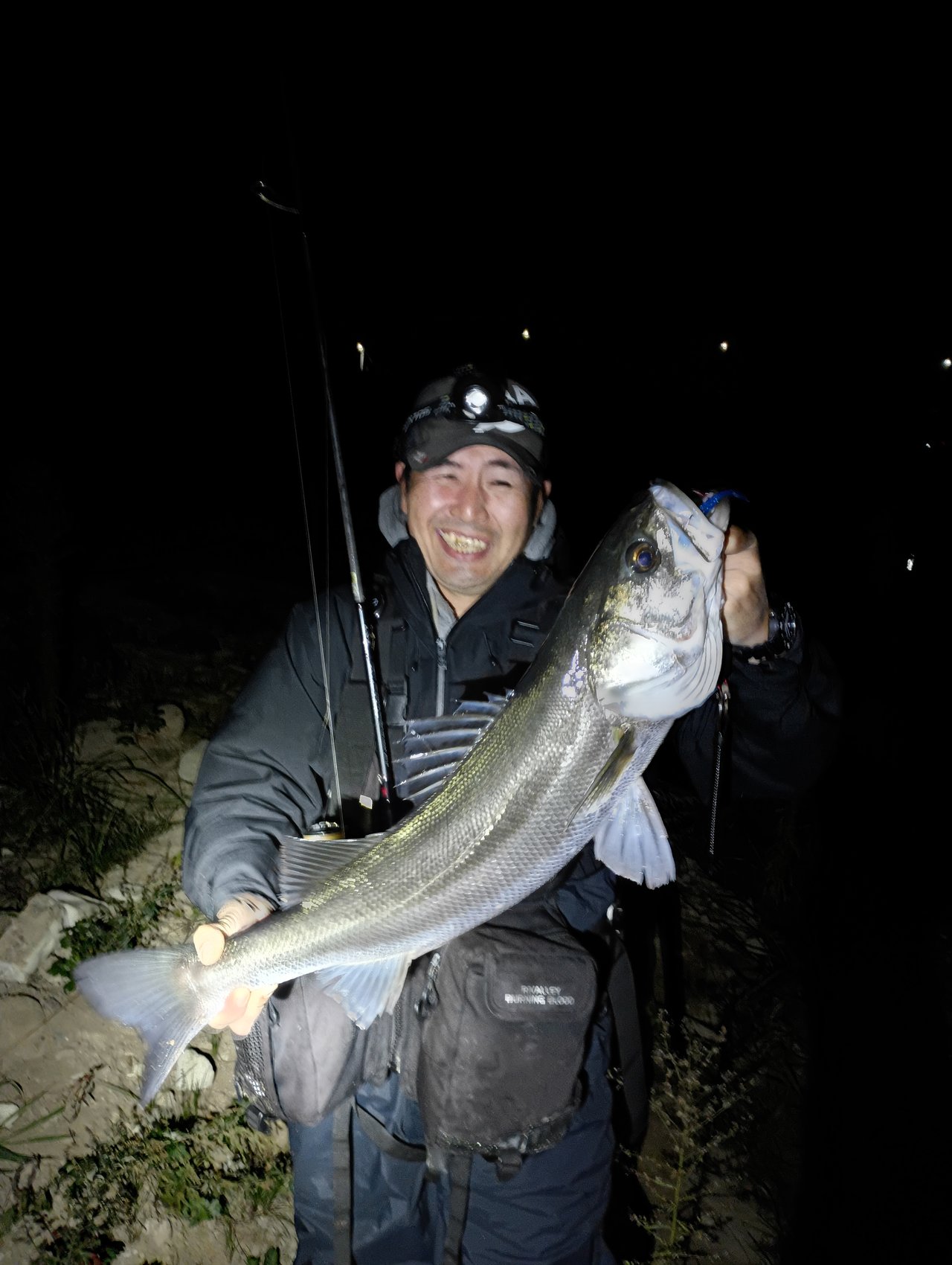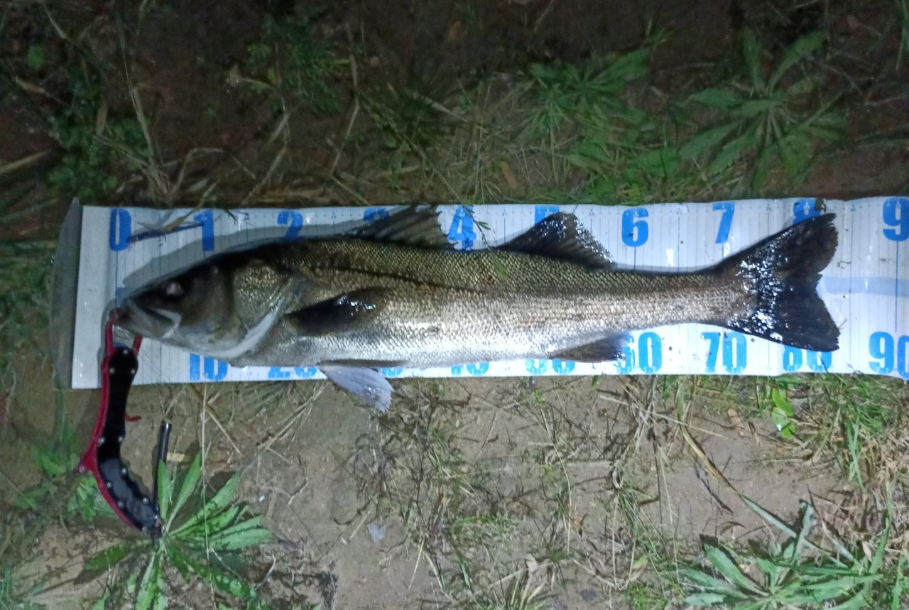 スタッフ美濃崎もポイントを譲って貰いますが流れが弱まり無反応。。違う場所に投げて機をうかがっていると再度流れが良い感じに。すかさず「R-32マリンブルー」で【梯川ちゅるんちゅるん釣法】を試すと71cmのシーバスをキャッチする事ができました!