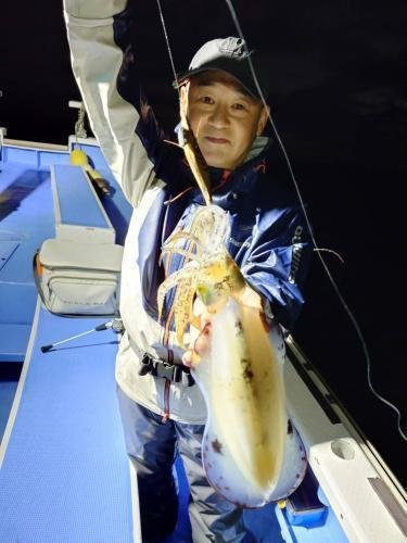 朝から船中ポツポツの当たりがあり自分にも小型ながら本命のアオリイカ。