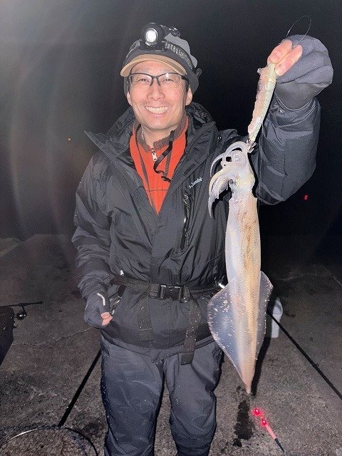 今年は数年ぶりに好調で、朝4時に着いたらすでに4隻が一級ポイントに・・・。シーバスポイントでスタートしますがお留守。戻って沖側からやってみると、UMさんが2ヒット1キャッチ、自分もそこにキャストして1キャッチ!その後アタリなく終了で6時前に帰港。