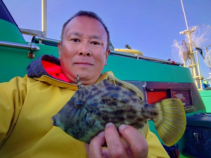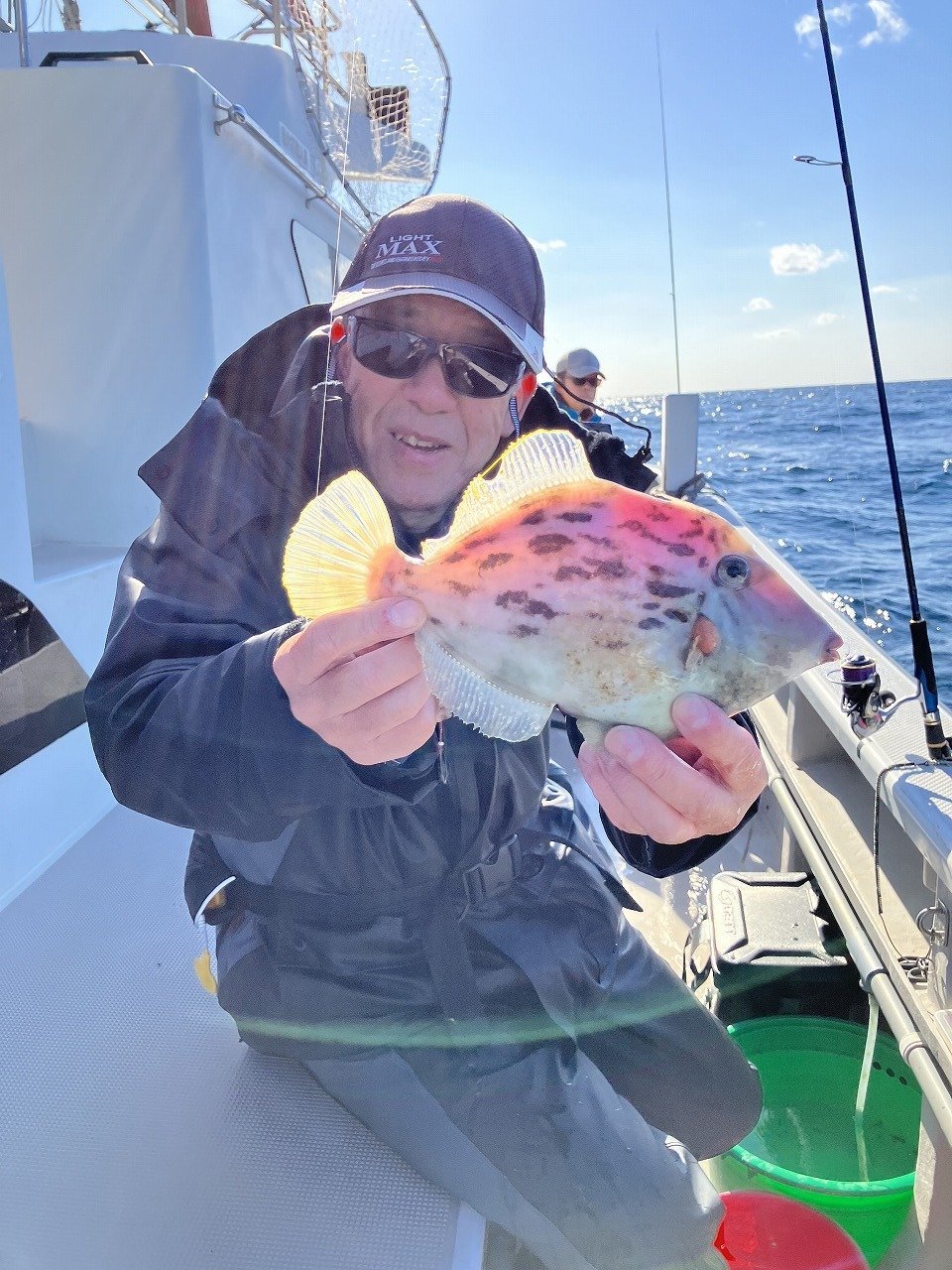 開始直後に同僚のツノさんが大型のカワハギを釣り上げご満悦。思いもよらない外道が釣れるのもテンヤマダイ釣りの楽しみの1つです。