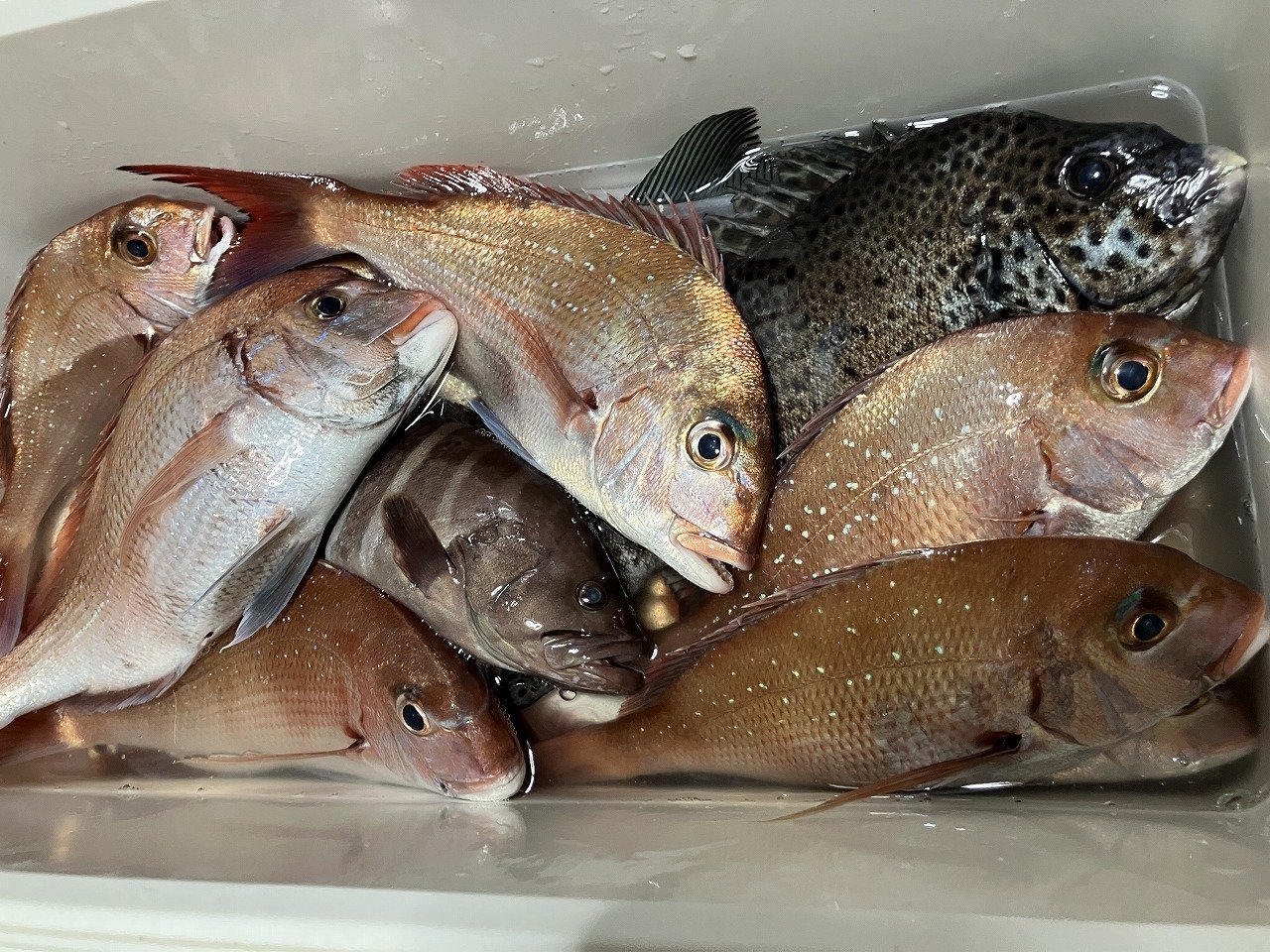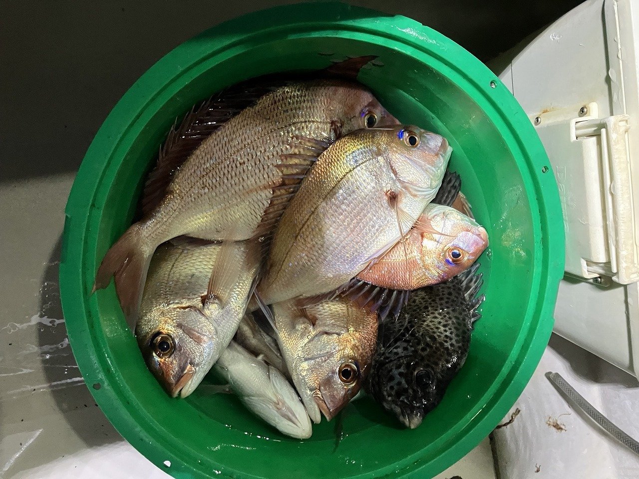 一方、私の方は、アタリもそこそこあったのですが、抜けやバレもあり、思ったほど中々数を伸ばせませんでしたが、マダイの型もそこそこで、イシガキダイのうれしいゲストも登場し、釣果的には十分にお土産ができました。