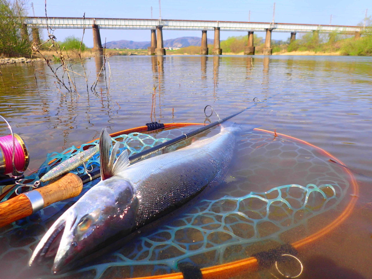 先日の釣果になりますが、今年も福井遠征の九頭竜川にてサクラマスを!降雨後の良いタイミングで川に立つ事が出来て狙っていたポイントでルアーを入れるとかなり良い手応えの適水勢。雰囲気抜群の中、フローティングミノーにHITしたのは小振りではありましたが素晴らしい九頭竜鱒でした♪その後、もう1HITありますがそちらはバラシの残念無念。上州屋オリカラスプーンのBUX「ユーシンブルー」にはファットなウグイ君が遊んでくれました。浅瀬には稚鮎が沢山遡上しており川は生命感でいっぱい!福井は丁度ソメイヨシノも満開で楽しい遠征釣行となりました!!