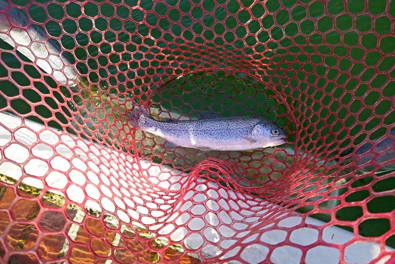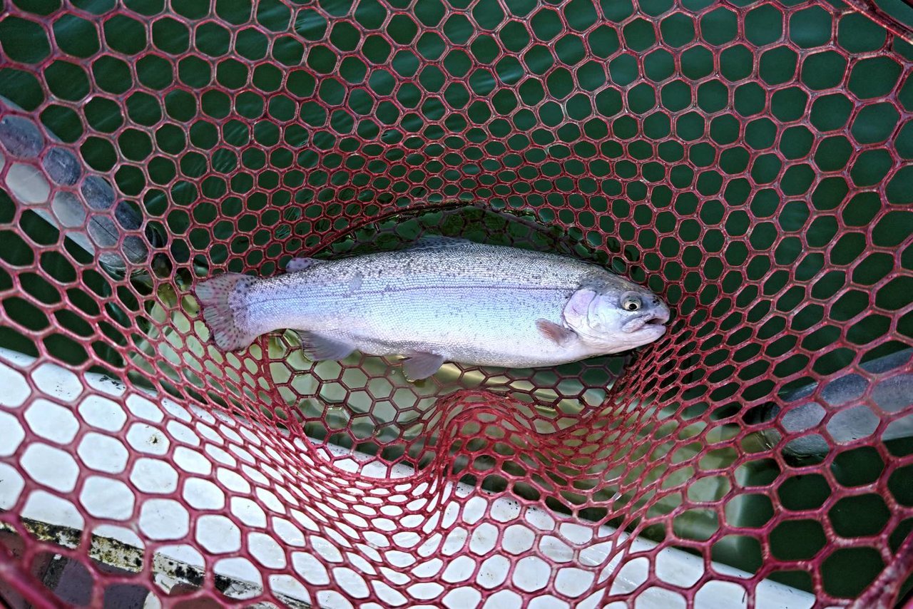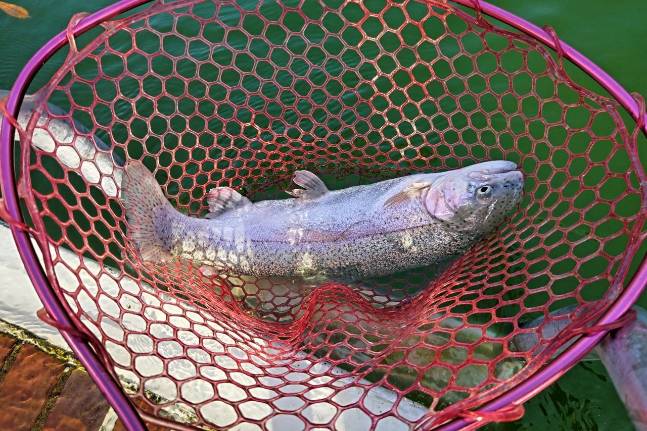 またもや【多摩湖駅前フィッシングエリア】に行ってきました。今回は前日にレギュラーサイズのニジマス他、イワナ、ブラウン、ブルックに彩サーモン、富士の介、イトウと魚種多様に放流がありました。水色が前回より緑がかってはいますが良い感じの水質です。スタートはバベルエース0.7gで前回同様に攻めますが音沙汰がありません。周りでは調子良く釣れています。ここでカラーチェンジし表層から巻き始めると待望のバイト。昨日放流があったので魚は浮き気味だったみたいです。流れも意外と強い場所だったので浮き過ぎず、沈め過ぎずのコントロールが難しいです。運よく【彩サーモン】が釣れた事と、途中ペレットタイムがあったので何とか助かりましたが完敗の気分です。前日の放流効果がまだ効いているみたいで動きのあるルアーのほうが効果的だったみたいでした。多摩湖駅前フィッシングエリアでは毎週金曜日が放流予定となっております。
