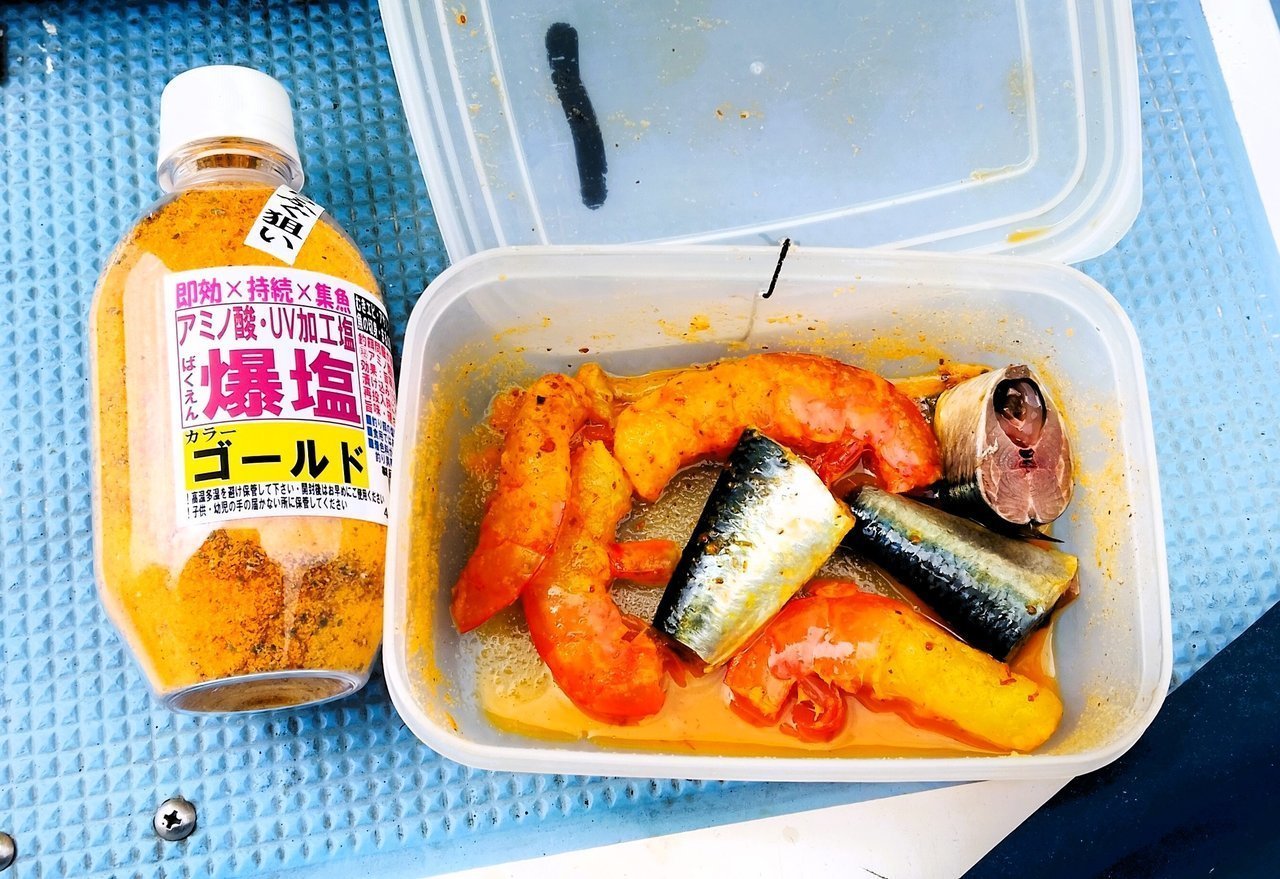 ■エサ:アルゼンチン赤エビ、イワシブツ切 ■仕掛:トラフグ専用仕掛け オモリ30号各色