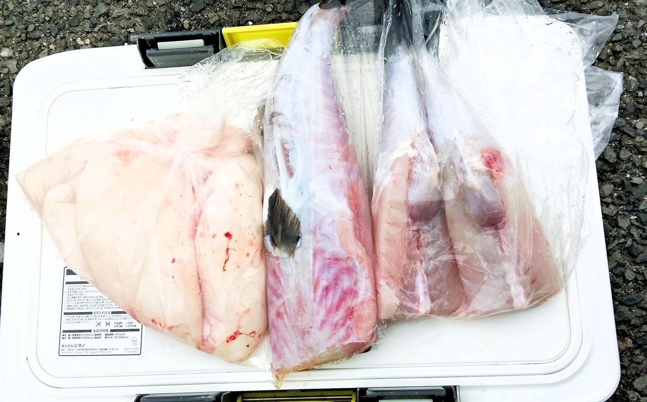 この日は無事に釣果を得たが規定数の5尾を釣る人も居れば凸の方が半数近くと釣果の差が付いた。現に自身の両隣は残念ながら凸であった。釣れる釣れないは紙一重のガチャの気はするが何の違いで差が出るのかは判然しない。ただ自身、気を使ったのは常に両隣数名とオモリのカラーが被らないようにマメなローテと針のカラーや釣れたら即、針は新品に交換、またエサは定番のエビとイワシを交互に装餌したが結果的にはエビのみの釣果。ただ餌には出船前から集魚剤をこれでもかとまぶして匂い付け、色付け、塩締めは行っていた。帰宅後、どれも魚体の重量の1/3は有ろうかのタップリの白子を堪能。身はテッサとぶつ切りにして鍋にて満腹。食べきれない身はさらに次の休暇まで寝かせて熟成させて食す予定。当日の釣行の詳細は店舗にてご案内を致します。数年前のXデーとなる釣れっぷりは無いもののチャンスは大いにある感じ。シーズン後期になるがチャレンジしてみてはいかがだろうか。