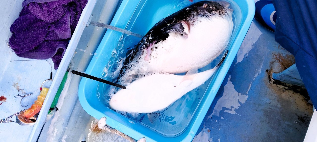 スタッフ吉岡の旨魚を求めて。Xデーはいつかとやきもきさせている白子タップリのデカトラフグ釣行。今期は低空飛行の釣果が続き待ち侘びていたがこのままシーズン終了もあると危惧して意を決して内房富津港より出船。航程70分程の富浦沖42~70mダチに満員乗船の勝山や金谷船が先行して攻めてる船団に合流。初物は水深45mダチの3投目、底から1~3mを探っていると2.5kgを無事にキャッチ成功。やや中だるみがある中、オモリの色や針のカラー、細かくタナを探る等の試行錯誤して2尾目、2kg級を追釣。極めつけは底から4mの指示タナ上限で止めているとフワッと糸のテンションが抜けてオマツリかと思いきやすぐにギュンッと力強く竿先が押さえ込まれてフルフッキング!ドラグが引き出されて良型と確信、ガクンガクンと抵抗する力強い引きをいなし無事に4.4kgのデカトラフグがネットイン!船中最大魚となる良型で満足の目標達成。その後は追加無くお昼に終了。