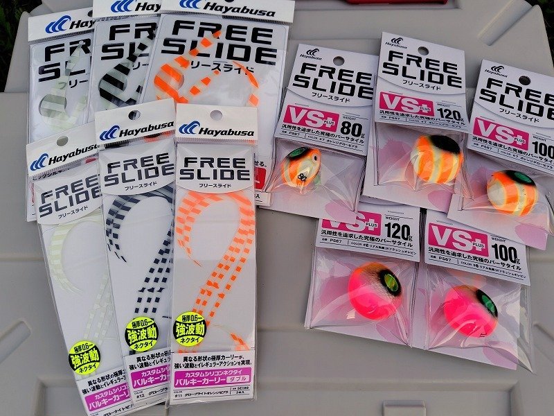 今回はご厚意によりバリバスさんからは新発売の「船PEX9レンジマスター」を、ハヤブサさんからは人気の「フリースライドシリーズ」よりVS+ヘッドやカスタムシリコンネクタイの各種新色などを使わせていただきました。
