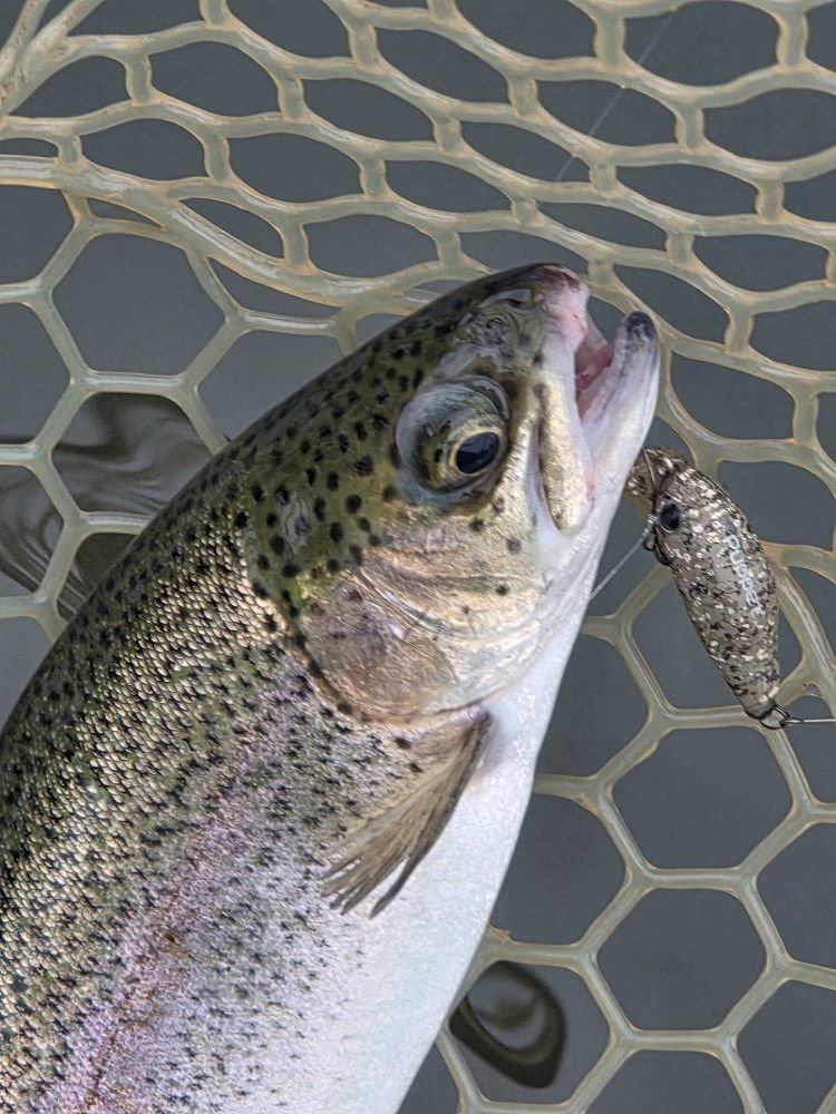 では本題に・・・急きょ前々日に釣友のYちゃんが休みが取れたという事でその場ですぐに予約し・・・用意もままならぬまま足柄CAにいってきました//朝から元気のいいマス達が・・・と言いたいとこでしたが、ちょっと反応が悪かった感じと思われました。すぐにポツポツと釣れ始めました。1~1.8g前後のスプーンとクランクで表層や上層で反応多く、ボトムは反応厳しい状況でした。朝方は表層を意識しているマス達が多いですネ//