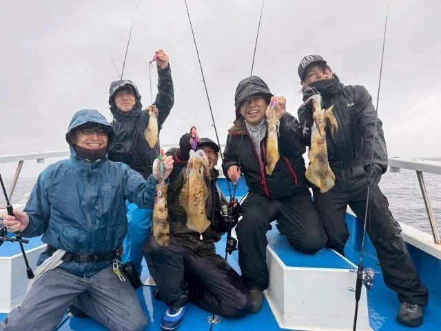 流れは1ノットオーバーで流れますが、湾より出るとウネリが強く特にみよしでは竿先とエギを安定させるのが大変な状況。そんな時こそこまめなウェイト調整が大切になってくるとの事でした。