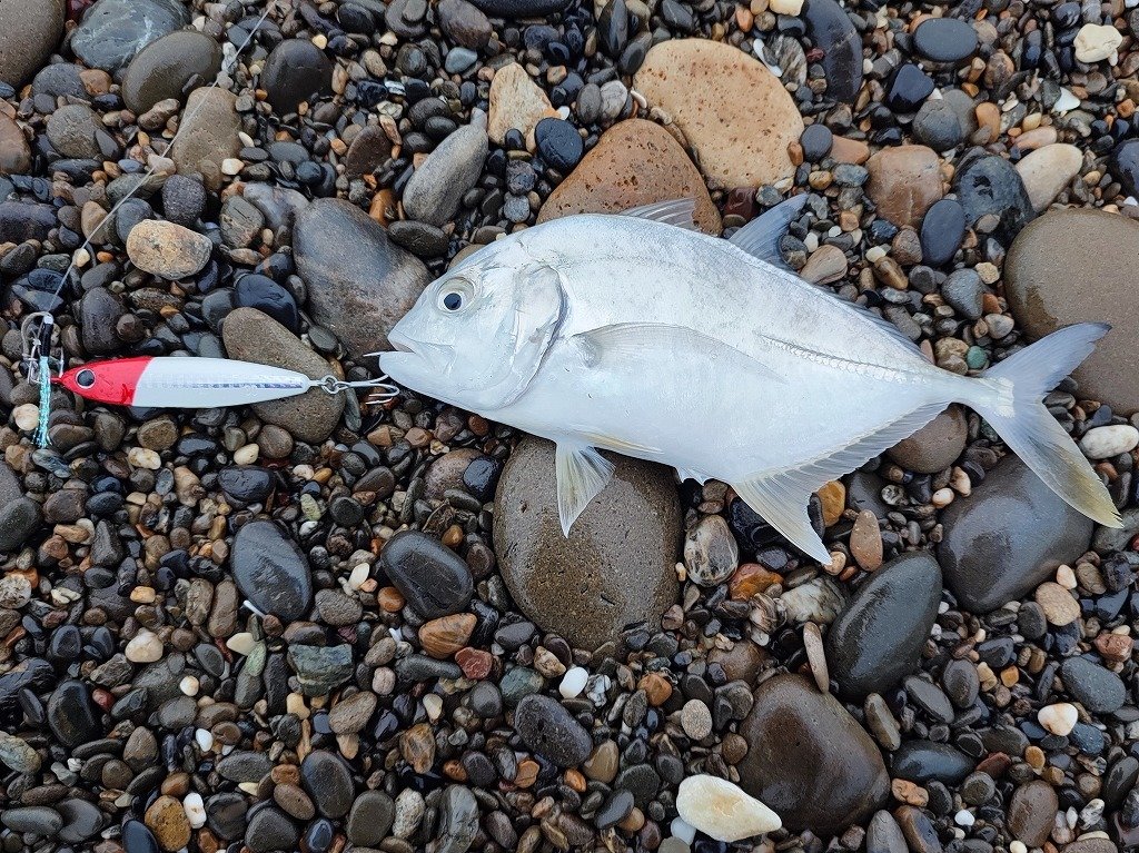すると波打ち際には無数のマイワシが打ちあがっているではありませんか!さらに海面を良く見ると80mぐらい沖にマイワシの群れらしい影が確認できたので、イワシを散らさないように群れのそばに朝一に反応のあった「フリッパーit」を通したら運良く良型のシーバスが釣れました(^^♪