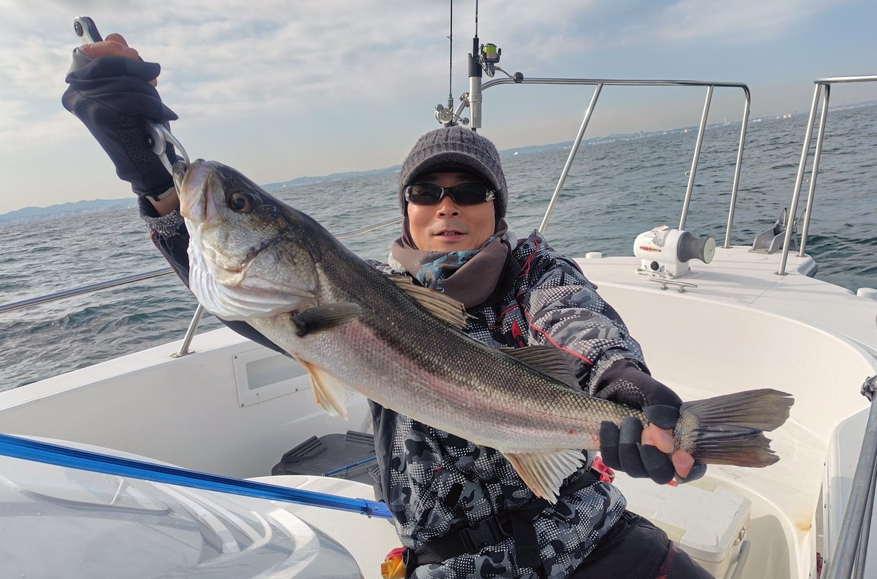 スタッフ北見です。友人のK津さん、Nさんと東京湾は浦賀発のボート釣りです。風が残り朝一はタイラバ。低水温の厳しい状況。実績ポイントではサバフグの猛攻。場所替えしてK津さんが良型アオハタやホウボウを釣りますが、本命見えず。風が落ち着くタイミングで横断して富津方面へ。鳥とベイトはみっちりといるのですが、ここでも低水温。魚探の温度は10.5℃と冷たい海。移動しましょうの掛け声でルアー回収していると、ん?何かしらヒットですが重いだけ。手前まで寄せた時いきなり、ドラグ鳴らして走ってなんと75Cmのシーバスでした。俄然やる気がでて粘り、K津さんのメタルバイブにヒット!今度はガツンと強烈なヒットでしたがフックアウト。やはり低水温で食い込みがあさいみたいです。