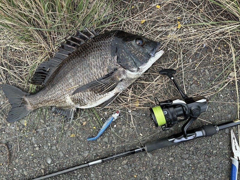 スタッフ高橋で~す!近郊ベイエリアでデイシーバスゲーム!今回は夕マズメ狙い。16時より開始して早速シーバスのチェイスあり!喰わんのかい・・場を荒らさない様、隣のストラクチャーへ移動すると、クロダイが沢山いてはります・・ルアーを通してみますと、興味は示すが追うまでにはいかず。再びシーバスのいるポイントを攻めると、足元まで帰ってきたローリングベイトをピックアップ中にチーバスが襲い掛かり、そのままフッキング成功です。今度はクロダイポイントを攻めます。ストラクチャーを超タイトに狙うと・・喰った!強引にリールを巻いて障害物から離し、最後は岸壁の際に潜るのをいなしてネットイン完了!カッコイイクロダイデス~!VJ22を喰ってくれましたよ!17時に終了!小1時間ほどの釣りでした。