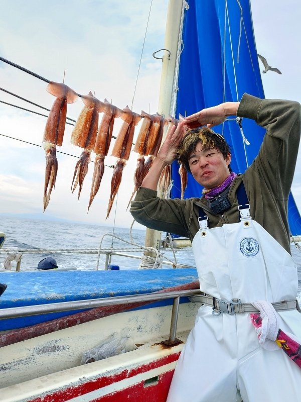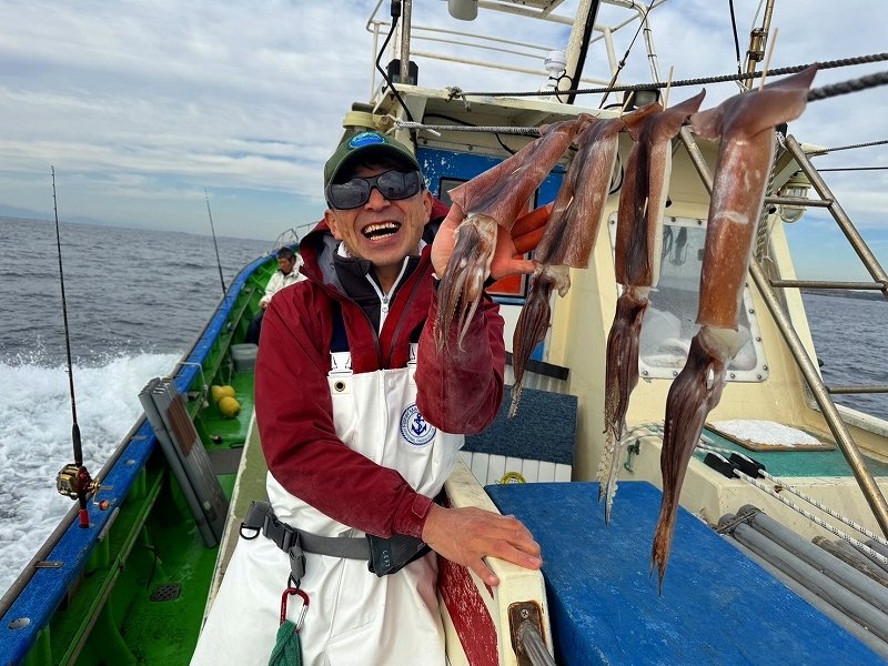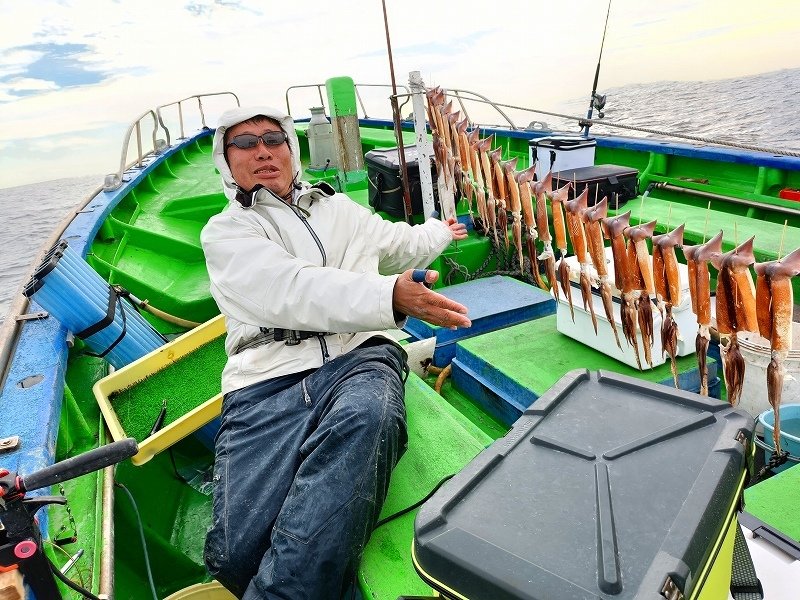 お客さまのHさまと長井の「福本丸」さんよりスルメイカ釣りに行って来ました。強風を避け前半は長井沖から攻めましたが空振り・・。風が収まるのを待って城ヶ島沖へ向かうと反応はあるものの、ポツポツと拾うテクニカルな展開。しかしただ一人、イカの気配を感じて掛ける釣り方のH様だけがコンスタントにイカを拾い続け、良い反応が出た際には4点掛けも見せる独壇場に(汗)。それなりの釣り手が揃う福本丸さんでしたがH様だけが断トツとなる21杯のスルメイカを釣り上げ、船長もビックリの釣果となりました。途中私も教えを請い真似をしましたが全く意味が分からず終了・・。嘗ては一緒にイカ釣り修行をしたHさまでしたが、タチウオやカワハギ等にも手を出す私と違い、イカ釣り一筋に命を削るHさまの凄みを感じる釣行となりました(笑)。ヤリイカ釣りのハイシーズンですが、巧みに直結仕掛けを操り、イカを捌いて干すなど、何かと忙しいスルメイカ釣りはマニアにはたまらない楽しみが有ります。冬のスルメイカは肝もたっぷりで、帰宅後の塩辛作りなどアフターフィッシングも充実です。今回乗船しました「福本丸」さんはスルメイカをメインにイカを狙う船宿さんです。船長や船宿のおかみさん、常連様達もとっても親切でフレンドリーな方ばかり。イカ釣り、特にスルメイカを愛する方にお勧めですのでどうぞお出かけくださいませ。