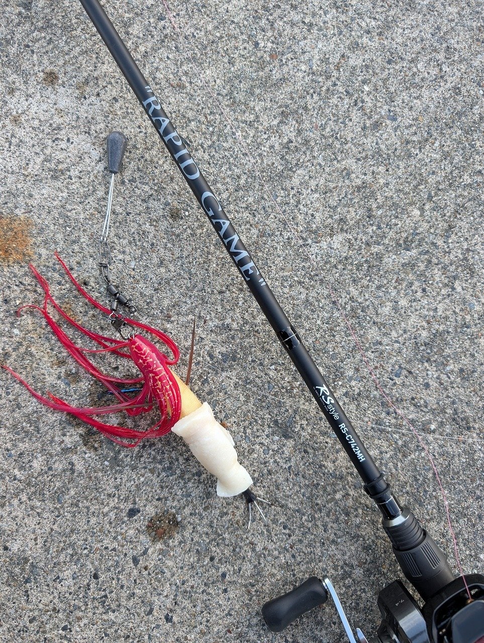 ■ロッド:イカ7-MH170 ■リール:シーボーグ600MJ ■ライン:PE3号 ■仕掛け:ピッカピカ針14~18㌢
