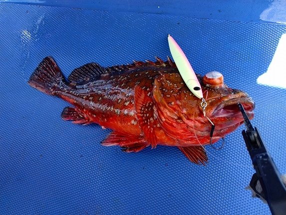ようやく「いいよ~」と1投目のアナウンス。自身はサバ狙いに意気地してフラッシャー仕掛け&150号オモリを投下!!普段なら着底前に仕掛の落下が止まりサバの多点掛けがこの釣りの魅力の一つでもあるのだがすんなりと仕掛が着底。