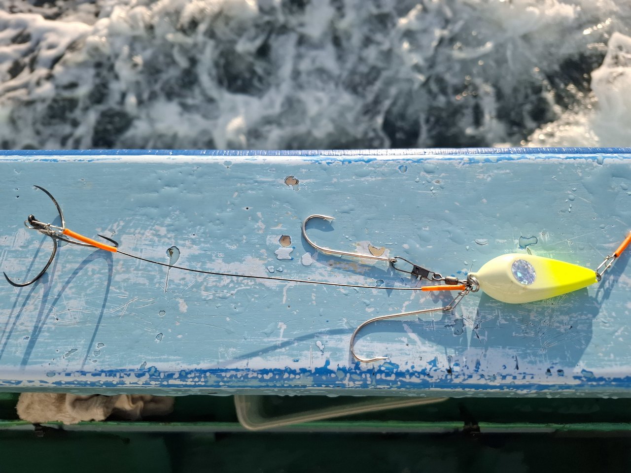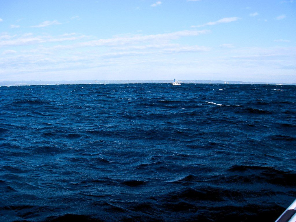 前日は荒天で出船中止の時化明け、添付画像で見える以上に白波、10m近い北東強風、高いウネリが残る海況。反応を探して慎重に潮回りをする船長がアナウンスで「サバの反応が少なく有ってもベタ底にまばらにある程度」。さらに「サバが少ないのでヤリイカ釣りたい人はブランコ仕掛けで構わないので下ろしてもいいよ」と耳を疑うアナウンスが追い打ちに。