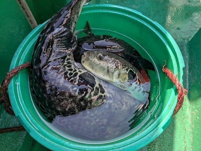 今シーズン好況が続いているトラフグに大所帯6名で釣行しました。釣行1週間前くらいまではトップでも1~2匹と厳しい状況でしたが、2~3日前から上向きに。結果は6名で12匹。全員が顔見れたわけではないですが、6人いれば釣れた状況を共有でき、ある程度の傾向は掴めますね♪当店斎藤はリミットの5匹、わたくし北垣は意地の1匹(終始船酔いでエサ交換よりトイレに駆け込む回数の方が多かった(-_-;))