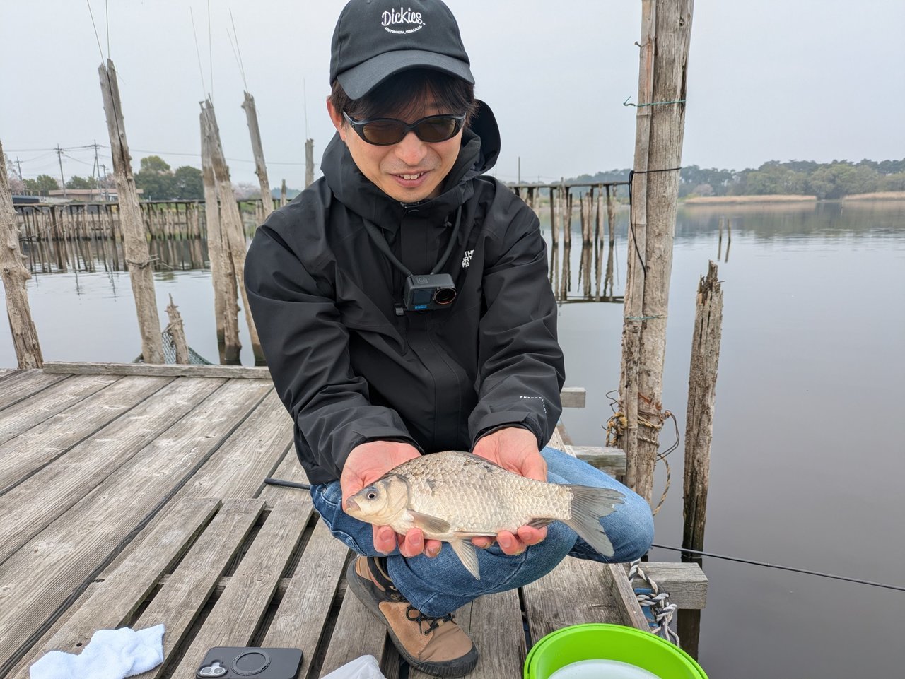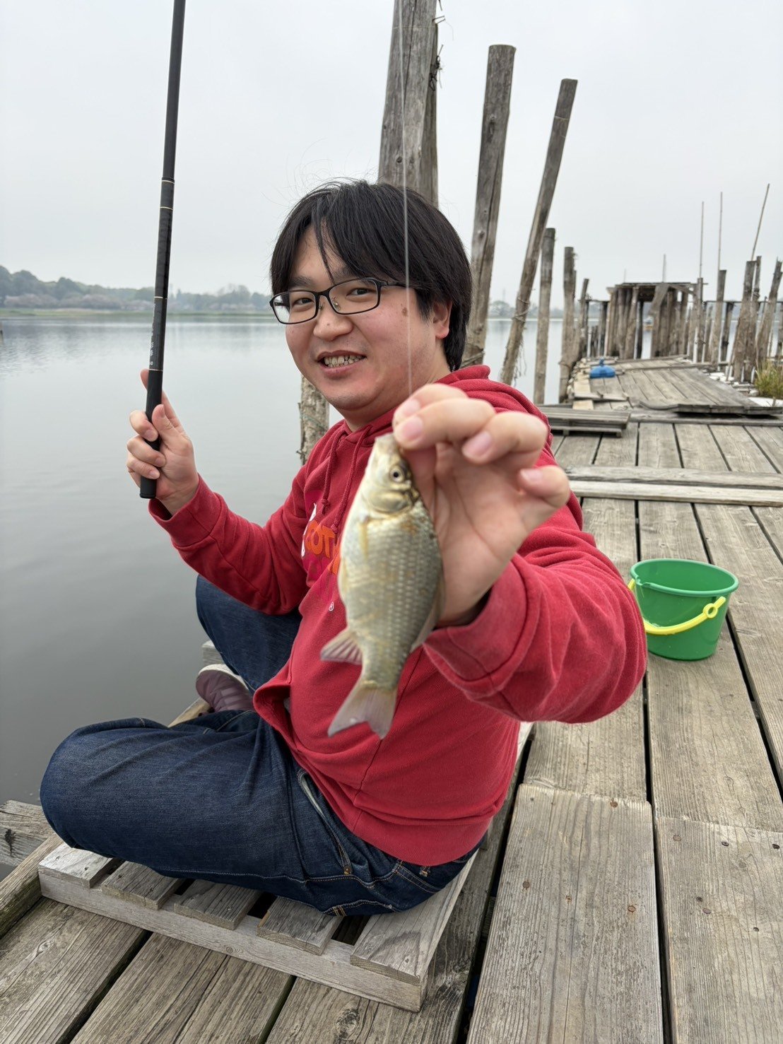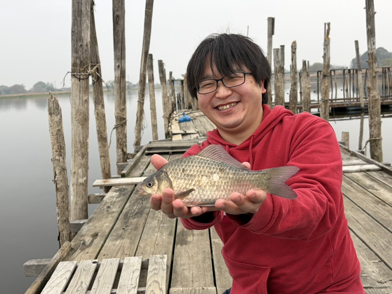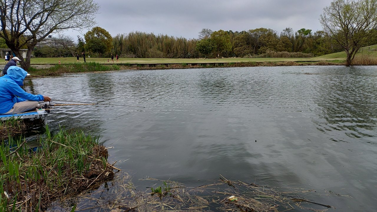 午前9時5分に到着し入漁券を購入してから釣り開始!塚原は3.6mののべ竿に玉ウキ仕掛けでエサはミミズ。安藤は2.7mののべ竿に玉うき仕掛けでエサはグルテン。開始1時間は陸からやるもこの日は反応がなく…。ちょうど桟橋が空いたので移動すると、徐々に魚の活性があがってきたようでいたるところで跳ねが見られるように。徐々にウキに反応がみられるようになり、コンスタントにアタリも出て飽きない程度にフナを釣ることができました!