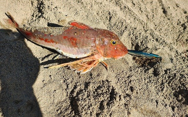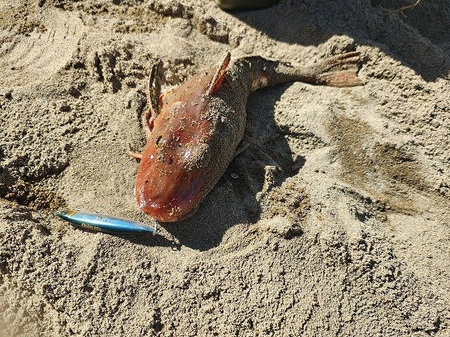 着底からの巻き出し直後にガツンと明確なアタリがあり、マゴチを確信するような引きでしたが、上がってきたのは良型のホウボウでした。